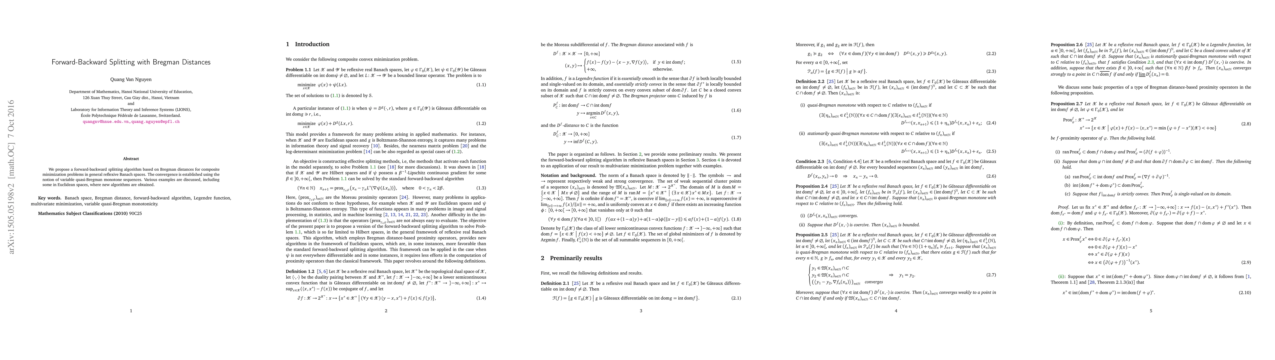 Summary: This paper introduces a forward-backward splitting algorithm utilizing Bregman distances for solving composite minimization problems in general reflexive Banach spaces, establishing convergence via variable quasi-Bregman monotone sequences, and presenting new algorithms in Euclidean spaces.