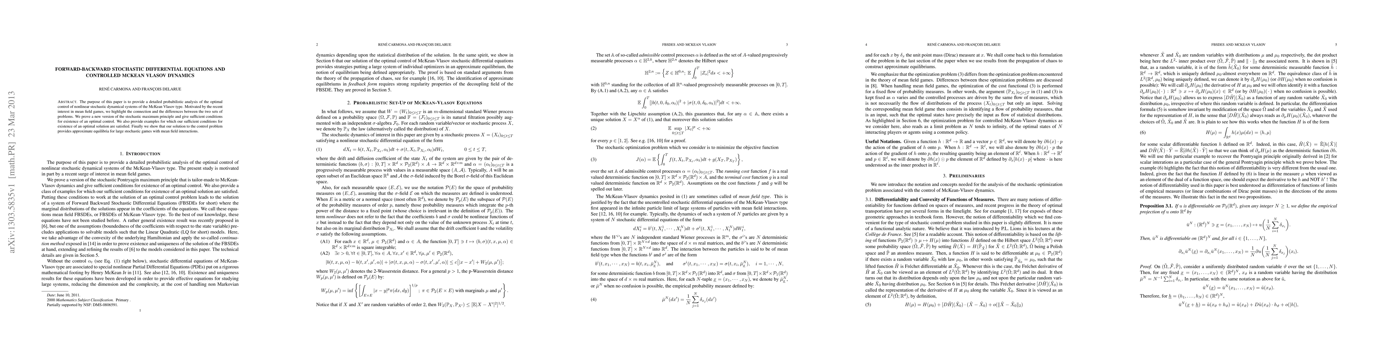 The purpose of this paper is to provide a detailed probabilistic analysis of the optimal control of nonlinear stochastic dynamical systems of the McKean Vlasov type. Motivated by the recent interest in mean field games, we highlight the connection and the differences between the two sets of problems. We prove a new version of the stochastic maximum principle and give sufficient conditions for existence of an optimal control. We also provide examples for which our sufficient conditions for existence of an optimal solution are satisfied. Finally we show that our solution to the control problem provides approximate equilibria for large stochastic games with mean field interactions.