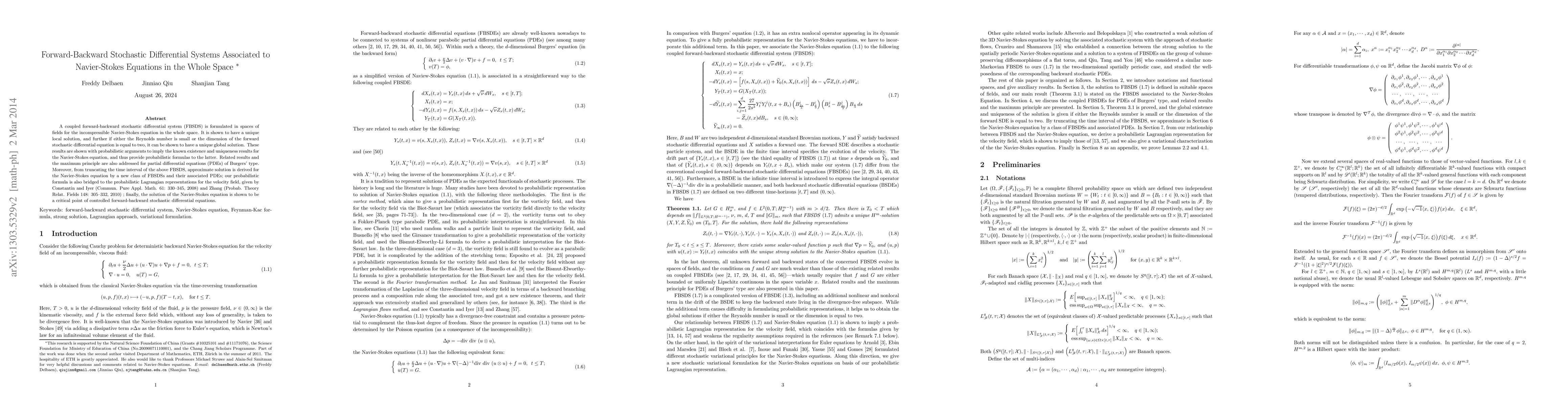 A coupled forward-backward stochastic differential system (FBSDS) is formulated in spaces of fields for the incompressible Navier-Stokes equation in the whole space. It is shown to have a unique local solution, and further if either the Reynolds number is small or the dimension of the forward stochastic differential equation is equal to two, it can be shown to have a unique global solution. These results are shown with probabilistic arguments to imply the known existence and uniqueness results for the Navier-Stokes equation, and thus provide probabilistic formulas to the latter. Related results and the maximum principle are also addressed for partial differential equations (PDEs) of Burgers' type. Moreover, from truncating the time interval of the above FBSDS, approximate solution is derived for the Navier-Stokes equation by a new class of FBSDSs and their associated PDEs; our probabilistic formula is also bridged to the probabilistic Lagrangian representations for the velocity field, given by Constantin and Iyer (Commun. Pure Appl. Math. 61: 330--345, 2008) and Zhang (Probab. Theory Relat. Fields 148: 305--332, 2010) ; finally, the solution of the Navier-Stokes equation is shown to be a critical point of controlled forward-backward stochastic differential equations.