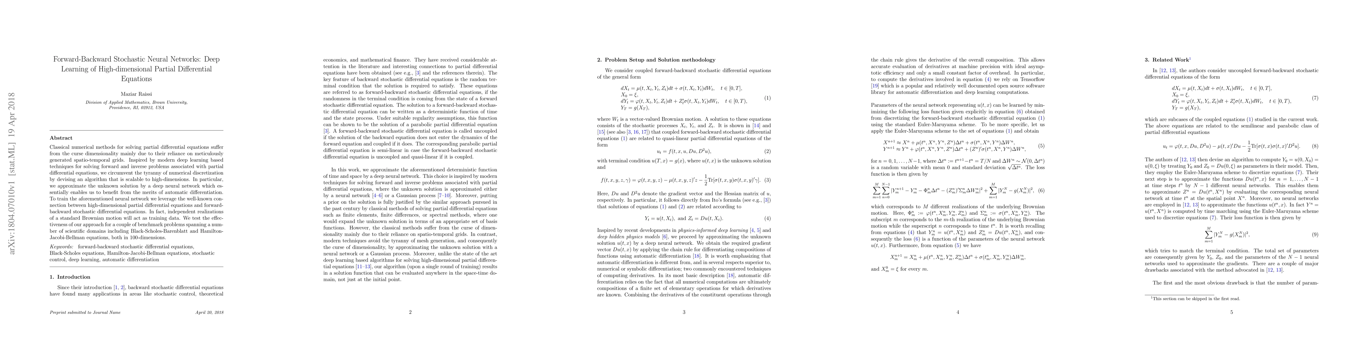 Classical numerical methods for solving partial differential equations suffer from the curse dimensionality mainly due to their reliance on meticulously generated spatio-temporal grids. Inspired by modern deep learning based techniques for solving forward and inverse problems associated with partial differential equations, we circumvent the tyranny of numerical discretization by devising an algorithm that is scalable to high-dimensions. In particular, we approximate the unknown solution by a deep neural network which essentially enables us to benefit from the merits of automatic differentiation. To train the aforementioned neural network we leverage the well-known connection between high-dimensional partial differential equations and forward-backward stochastic differential equations. In fact, independent realizations of a standard Brownian motion will act as training data. We test the effectiveness of our approach for a couple of benchmark problems spanning a number of scientific domains including Black-Scholes-Barenblatt and Hamilton-Jacobi-Bellman equations, both in 100-dimensions.