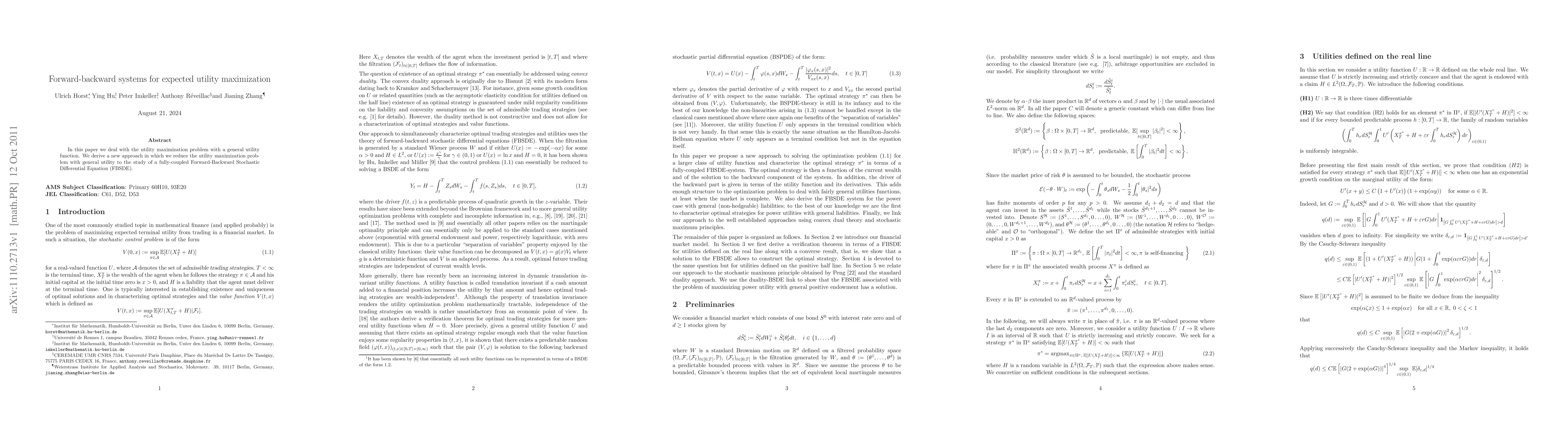 The paper derives a new approach to utility maximization with general utility functions by reducing the problem to a fully-coupled Forward-Backward Stochastic Differential Equation (FBSDE).