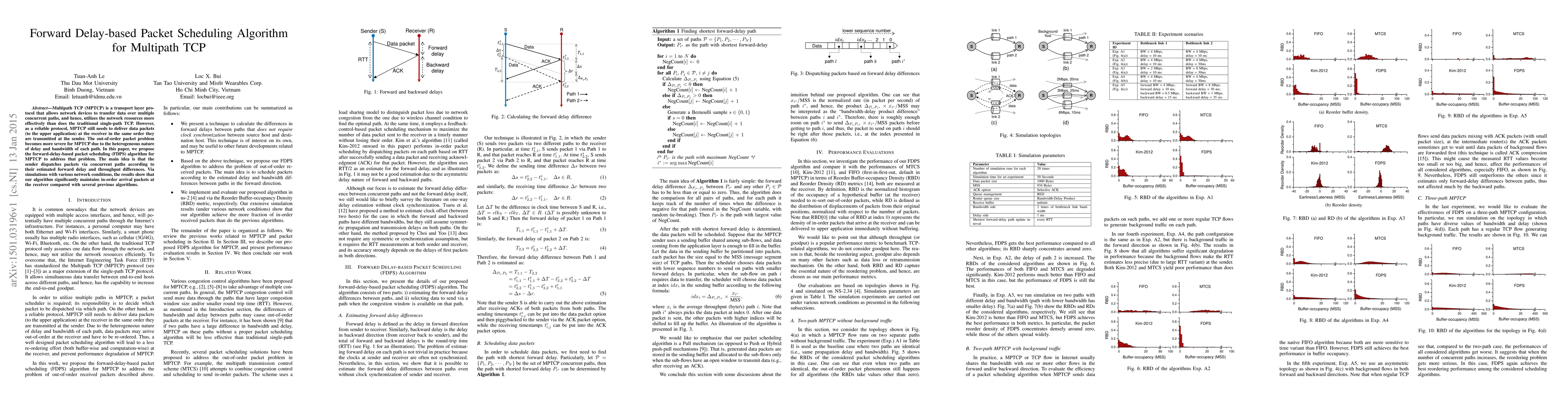 This paper proposes a forward-delay-based packet scheduling (FDPS) algorithm for Multipath TCP (MPTCP) to manage out-of-order packets by dispatching packets based on estimated forward delay and throughput differences. The results from simulations indicate that FDPS significantly improves in-order packet delivery compared to previous methods.