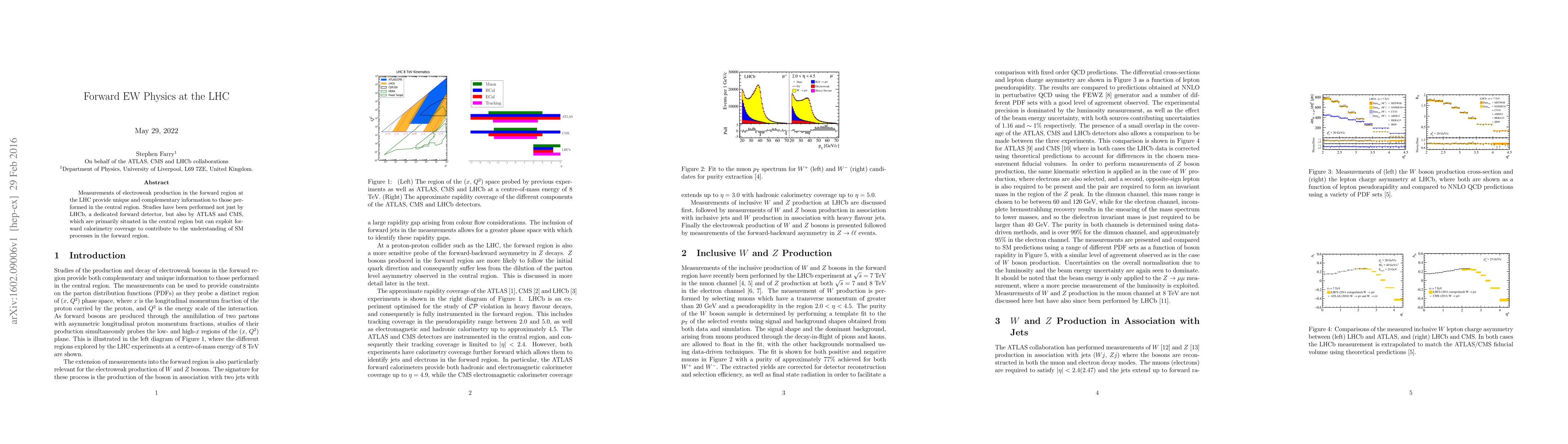Summary: This paper investigates electroweak production in the forward region at the LHC, highlighting the unique insights provided by forward detectors like LHCb and the contributions of central detectors ATLAS and CMS through their forward calorimetry. These studies enhance the understanding of Standard Model processes in the forward region.