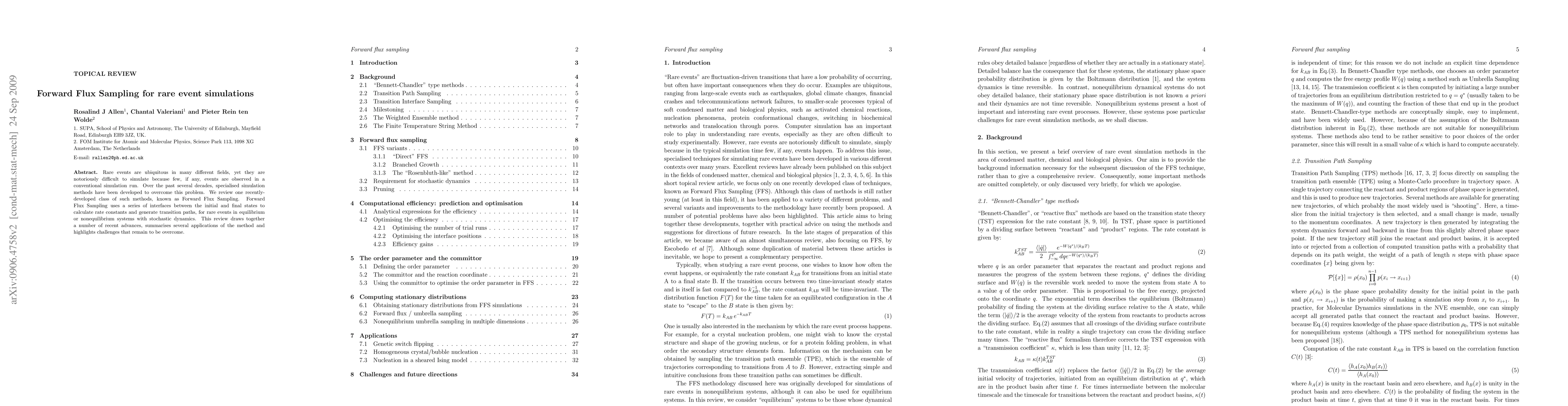 Forward Flux Sampling is a specialized method for simulating rare events by calculating rate constants and generating transition paths through interfaces between initial and final states. This review synthesizes recent advances, applications, and ongoing challenges in employing this method for both equilibrium and nonequilibrium systems.