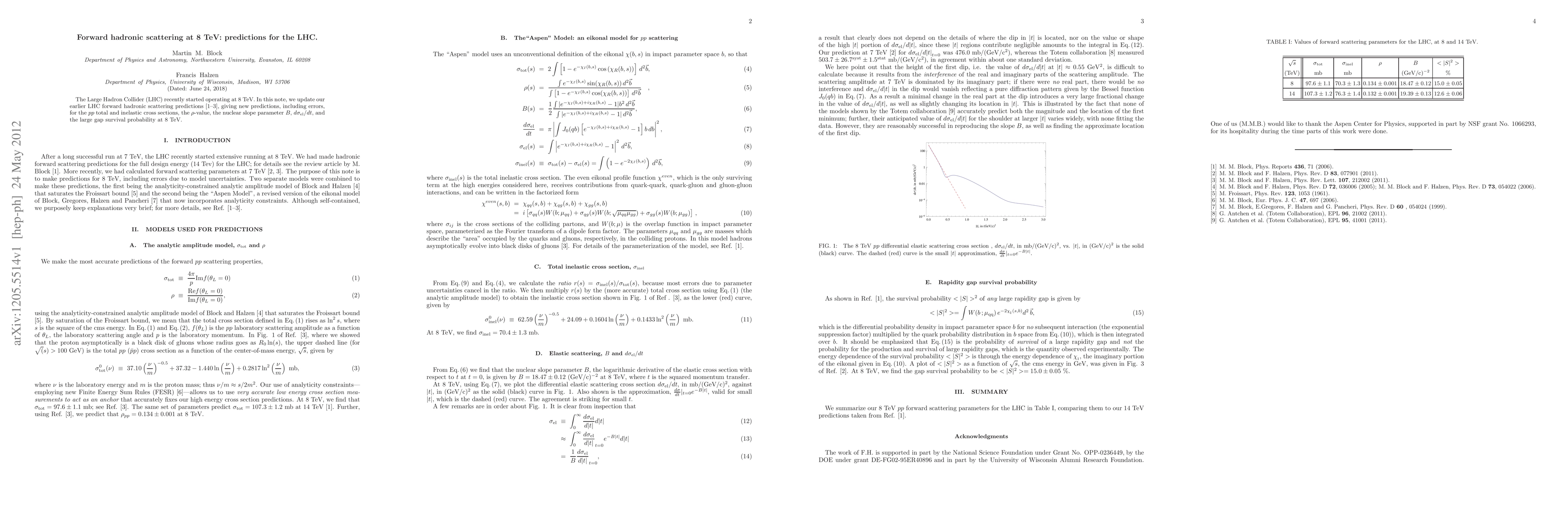 The Large Hadron Collider (LHC) recently started operating at 8 TeV. In this note, we update our earlier LHC forward hadronic scattering predictions \cite{physicsreports,update7, blackdisk}, giving new predictions, including errors, for the $pp$ total and inelastic cross sections, the $\rho$-value, the nuclear slope parameter $B$, $d\sigma_{\rm el}/dt$, and the large gap survival probability at 8 TeV.
