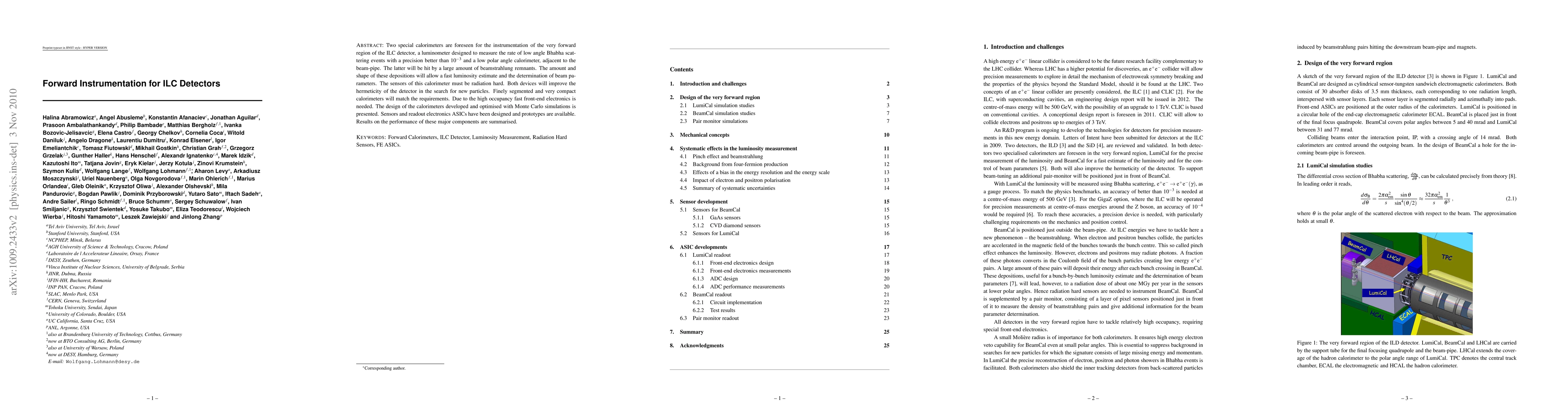 Two special calorimeters are foreseen for the instrumentation of the very forward region of the ILC detector, a luminometer designed to measure the rate of low angle Bhabha scattering events with a precision better than 10-3 and a low polar angle calorimeter, adjacent to the beam-pipe. The latter will be hit by a large amount of beamstrahlung remnants. The amount and shape of these depositions will allow a fast luminosity estimate and the determination of beam parameters. The sensors of this calorimeter must be radiation hard. Both devices will improve the hermeticity of the detector in the search for new particles. Finely segmented and very compact calorimeters will match the requirements. Due to the high occupancy fast front-end electronics is needed. The design of the calorimeters developed and optimised with Monte Carlo simulations is presented. Sensors and readout electronics ASICs have been designed and prototypes are available. Results on the performance of these major components are summarised.