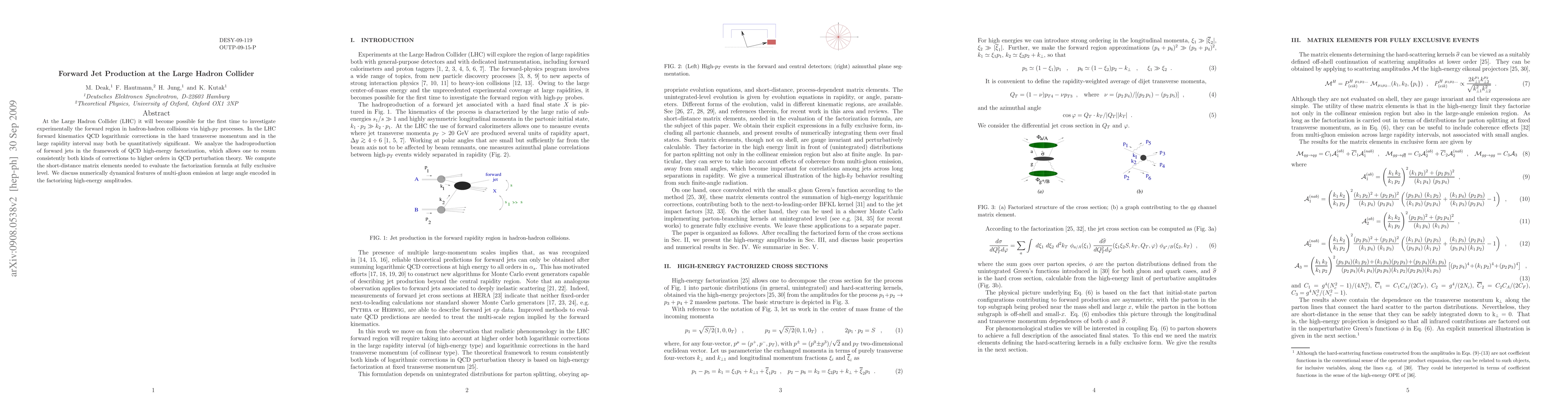 At the Large Hadron Collider (LHC) it will become possible for the first time to investigate experimentally the forward region in hadron-hadron collisions via high-$p_T$ processes. In the LHC forward kinematics QCD logarithmic corrections in the hard transverse momentum and in the large rapidity interval may both be quantitatively significant. We analyze the hadroproduction of forward jets in the framework of QCD high-energy factorization, which allows one to resum consistently both kinds of corrections to higher orders in QCD perturbation theory. We compute the short-distance matrix elements needed to evaluate the factorization formula at fully exclusive level. We discuss numerically dynamical features of multi-gluon emission at large angle encoded in the factorizing high-energy amplitudes.