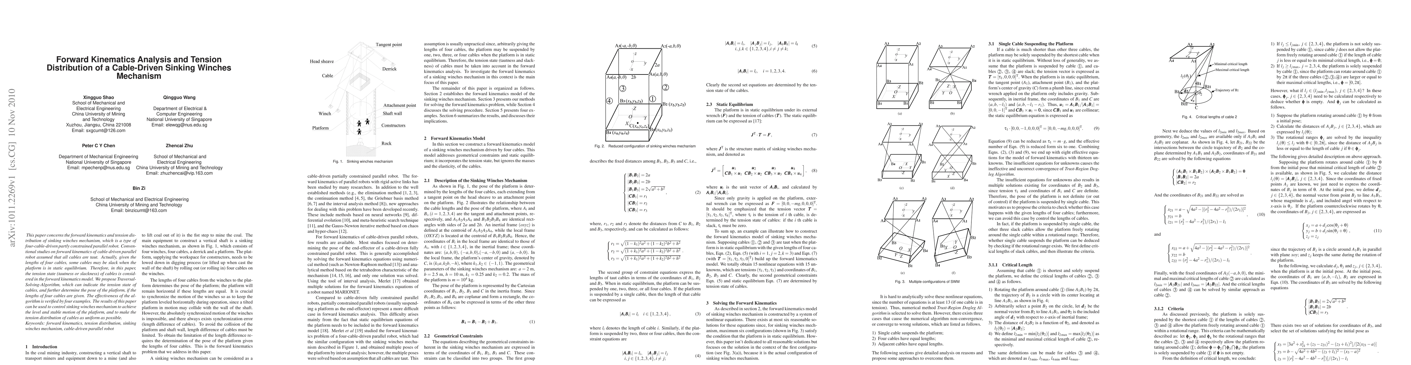 This paper concerns the forward kinematics and tension distribution of sinking winches mechanism, which is a type of four-cable-driven partly constrained parallel robot. Conventional studies on forward kinematics of cable-driven parallel robot assumed that all cables are taut. Actually, given the lengths of four cables, some cables may be slack when the platform is in static equilibrium. Therefore, in this paper, the tension state (tautness or slackness) of cables is considered in the forward kinematics model. We propose Traversal-Solving-Algorithm, which can indicate the tension state of cables, and further determine the pose of the platform, if the lengths of four cables are given. The effectiveness of the algorithm is verified by four examples. The results of this paper can be used to control sinking winches mechanism to achieve the level and stable motion of the platform, and to make the tension distribution of cables as uniform as possible.