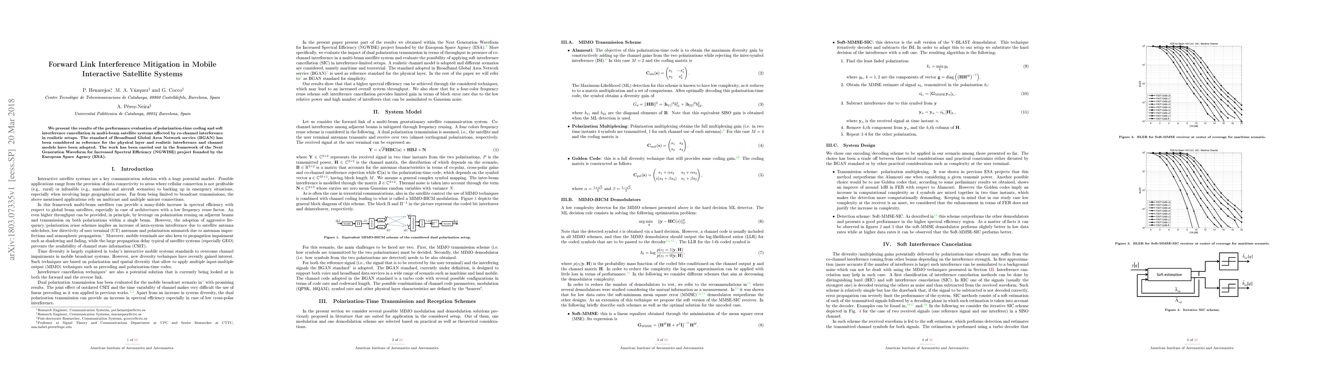We present the results of the performance evaluation of polarization-time coding and soft interference cancellation in multi-beam satellite systems affected by co-channel interference in realistic setups. The standard of Broadband Global Area Network service (BGAN) has been considered as reference for the physical layer and realistic interference and channel models have been adopted. The work has been carried out in the framework of the Next Generation Waveform for Increased Spectral Efficiency (NGWISE) project founded by the European Space Agency (ESA).
