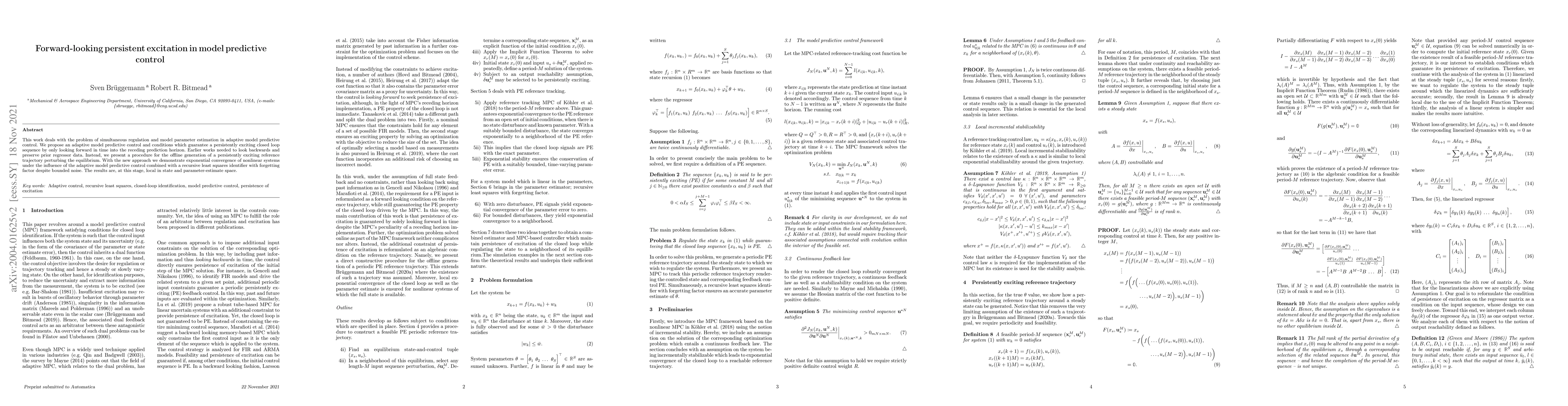 This paper proposes an adaptive model predictive control method that guarantees forward-looking persistent excitation, enabling simultaneous regulation and parameter estimation without needing historical regressor data. The approach demonstrates exponential convergence of nonlinear systems under bounded noise.