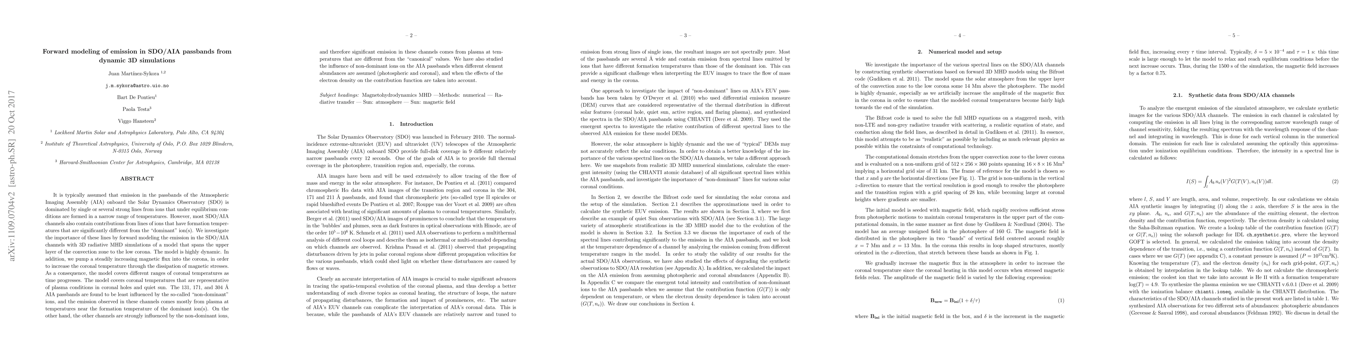 This paper investigates the emission in SDO/AIA channels using forward modeling from dynamic 3D simulations, finding that while some channels are dominated by "dominant" ions, others are significantly influenced by ions with different formation temperatures. The study also considers the effects of varying element abundances and electron density on the emission.