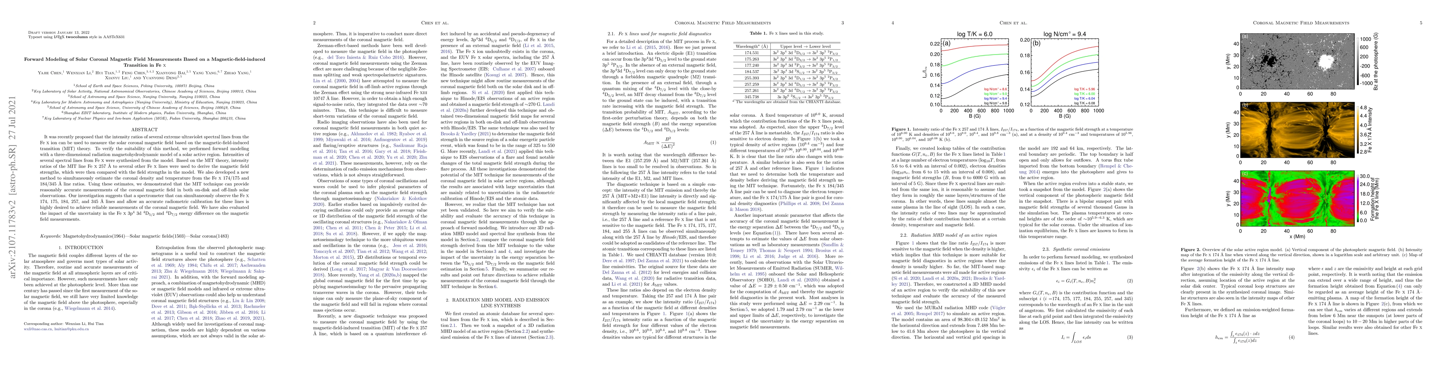 This paper investigates the use of magnetic-field-induced transition (MIT) in Fe X spectral lines to measure the solar coronal magnetic field through forward modeling. The study demonstrates that intensity ratios of Fe X lines can provide accurate magnetic field strength estimates, and proposes a new method for estimating coronal density and temperature using Fe X lines.