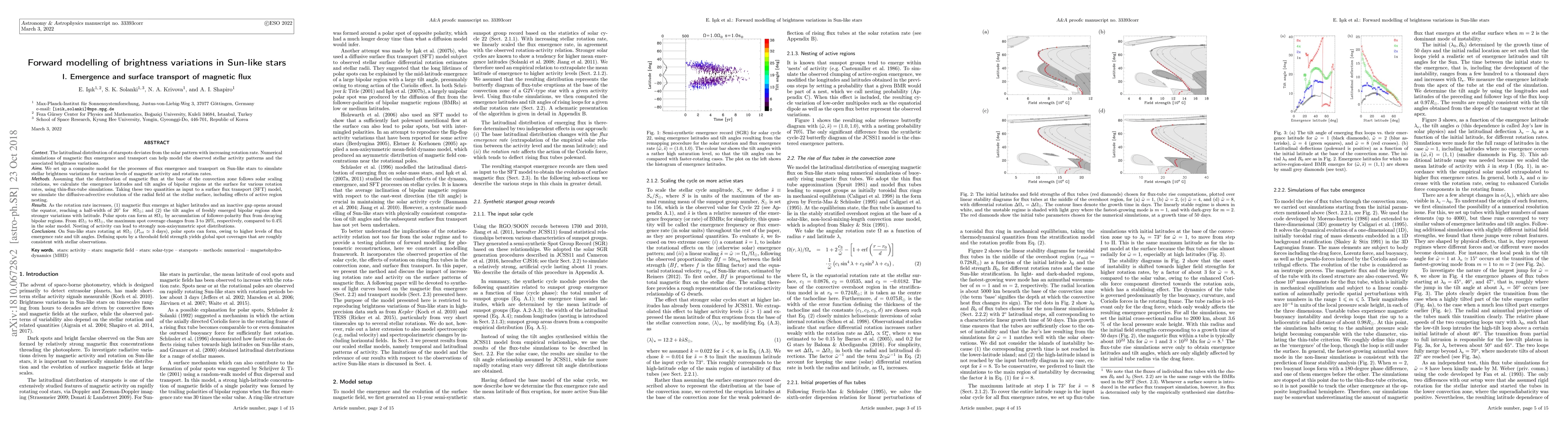 This paper models brightness variations in Sun-like stars by simulating magnetic flux emergence and transport, showing that higher rotation rates lead to flux emergence at higher latitudes and increased spot coverage, with polar spots forming at extreme rotation rates. The model aligns with observed stellar activity patterns.
