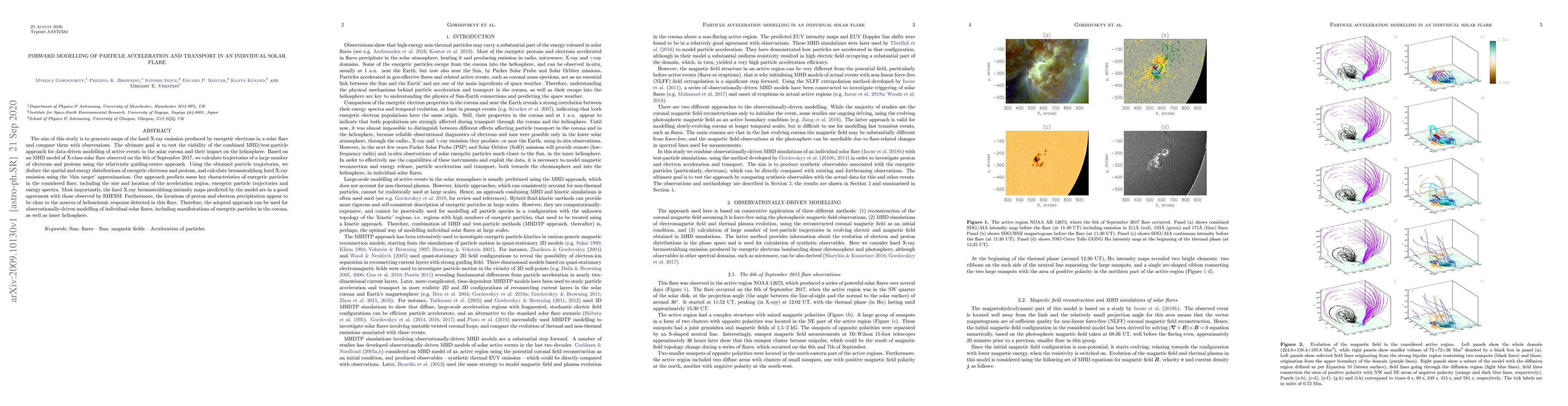 This study models the hard X-ray emission from energetic electrons in a solar flare using an MHD/test-particle approach, predicting particle trajectories and energy spectra, and comparing results to RHESSI observations. The model's success in matching observed hard X-ray maps supports its use for data-driven modelling of solar flares and energetic particle behavior.
