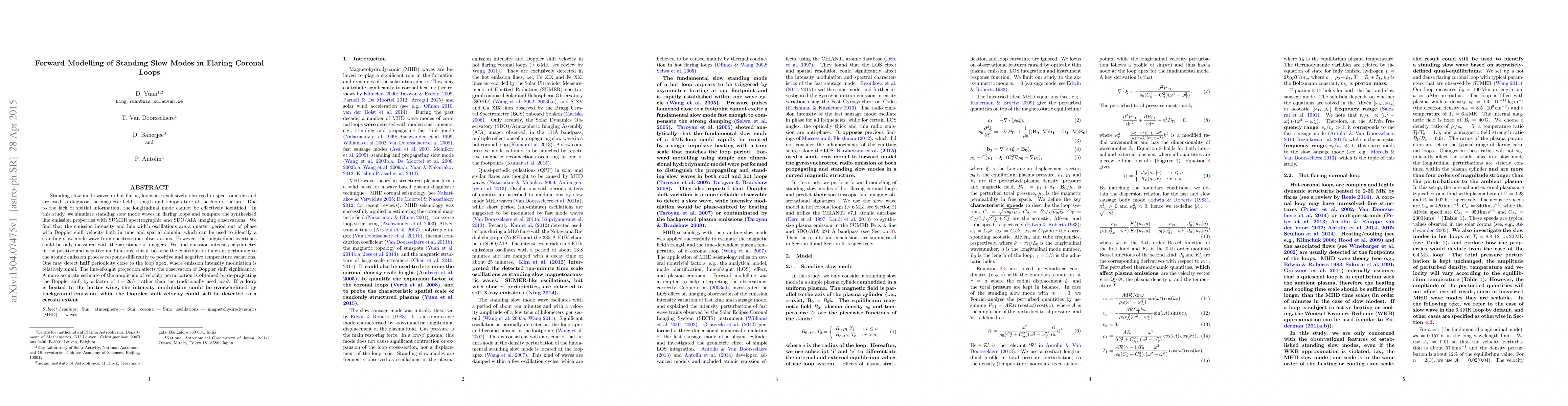 This study simulates standing slow mode waves in flaring coronal loops to diagnose magnetic field strength and temperature, finding that emission intensity and line width oscillations are out of phase with Doppler shift velocity. The research suggests that while spectroscopic observations can identify standing slow modes, longitudinal overtones require imaging assistance, and accurate velocity perturbation amplitude estimates require de-projection factors.