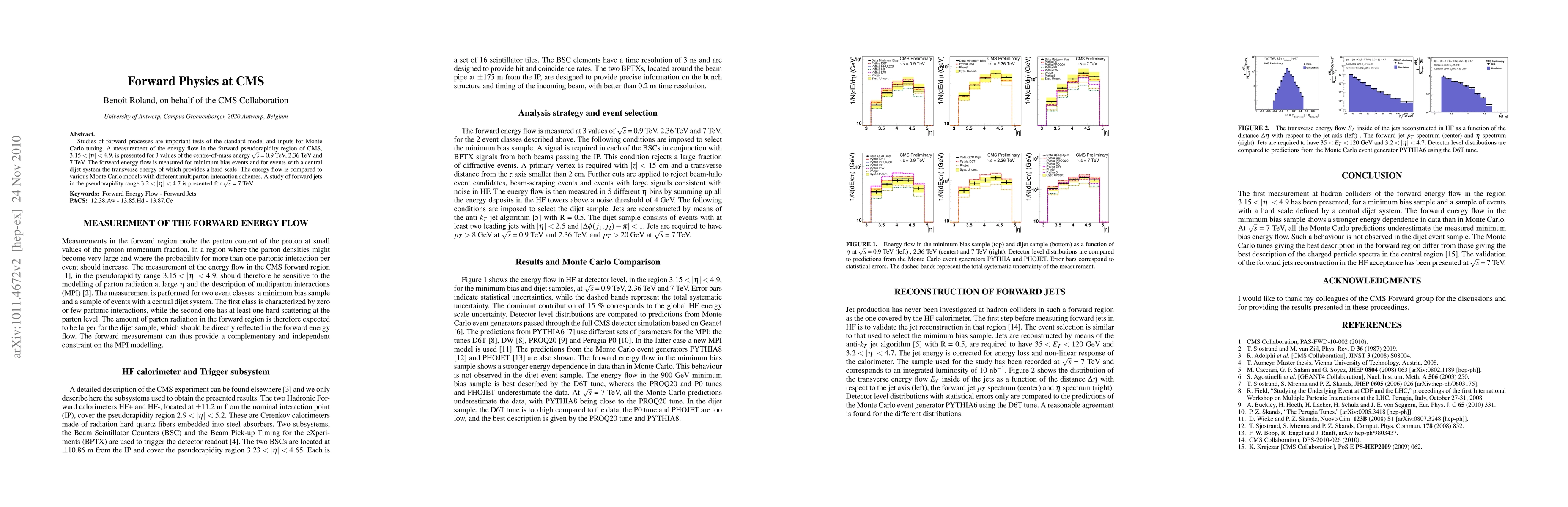 This paper presents measurements of energy flow in the forward pseudorapidity region of CMS for different center-of-mass energies, comparing results to Monte Carlo models, and studies forward jets for a specific energy level to test the Standard Model and refine Monte Carlo simulations.