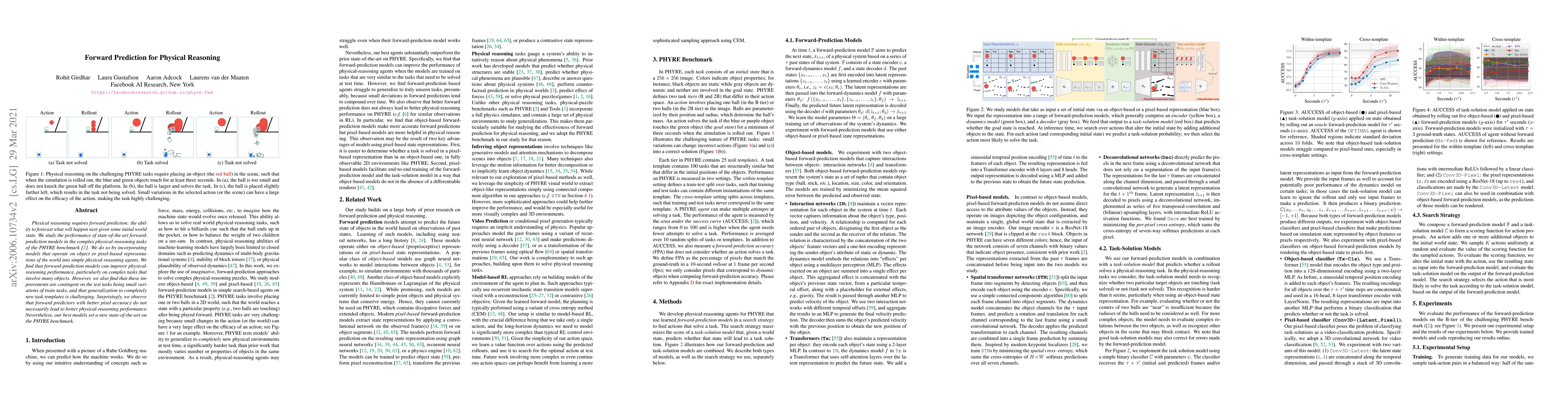 This paper explores how forward-prediction models enhance physical reasoning in complex tasks using the PHYRE benchmark, finding that while they improve performance on similar tasks, generalization to new tasks remains difficult. Despite better pixel accuracy not always correlating with better reasoning, the best models achieve new state-of-the-art results.