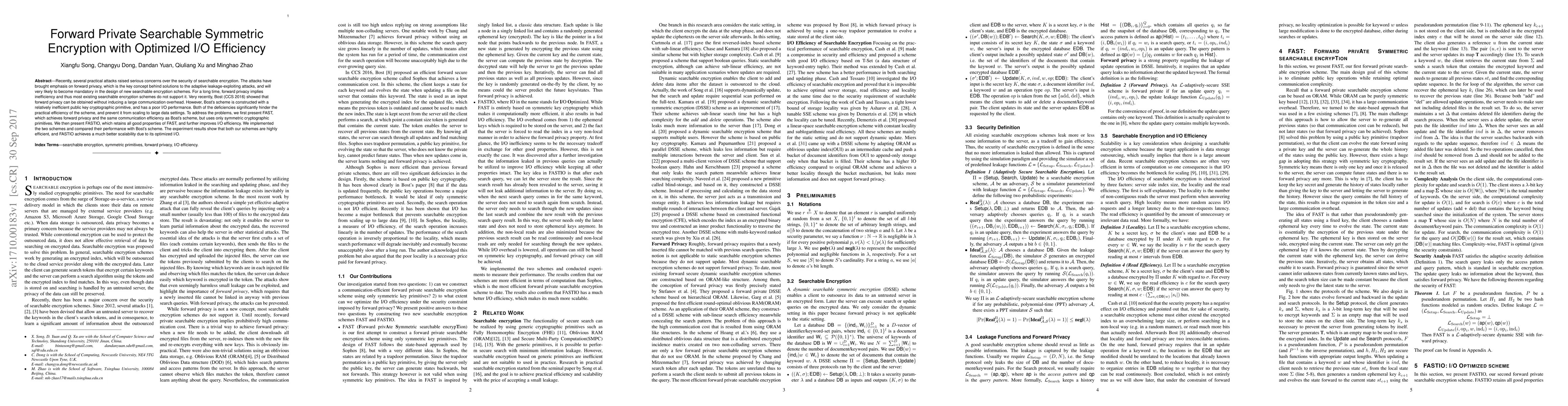 This paper proposes FAST and FASTIO, two forward private searchable symmetric encryption schemes that achieve efficient communication and optimized I/O performance, addressing the inefficiencies in existing schemes and improving scalability for large data settings.