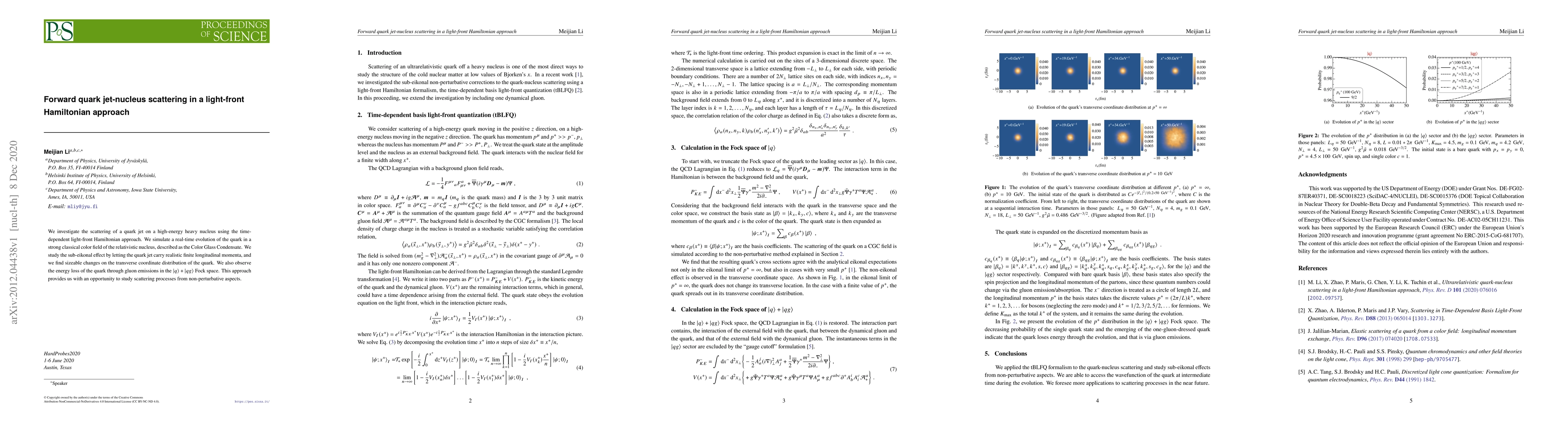 We investigate the scattering of a quark jet on a high-energy heavy nucleus using the time-dependent light-front Hamiltonian approach. We simulate a real-time evolution of the quark in a strong classical color field of the relativistic nucleus, described as the Color Glass Condensate. We study the sub-eikonal effect by letting the quark jet carry realistic finite longitudinal momenta, and we find sizeable changes on the transverse coordinate distribution of the quark. We also observe the energy loss of the quark through gluon emissions in the $\ket{q}+\ket{qg}$ Fock space. This approach provides us with an opportunity to study scattering processes from non-perturbative aspects.