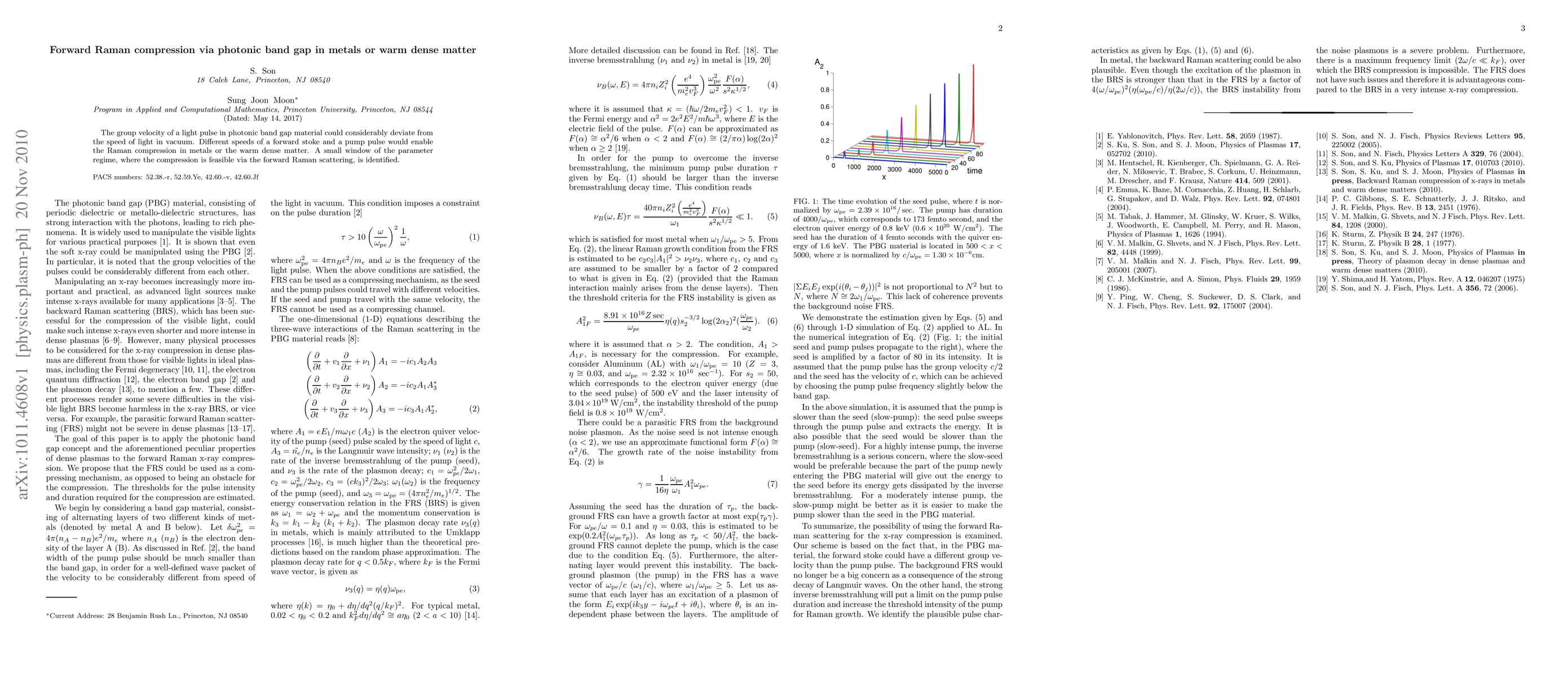 This paper explores the potential for Raman compression of light pulses in photonic band gap materials, where differing velocities of forward stokes and pump pulses allow for compression in metals or warm dense matter. A specific parameter regime enabling this forward Raman compression is identified.
