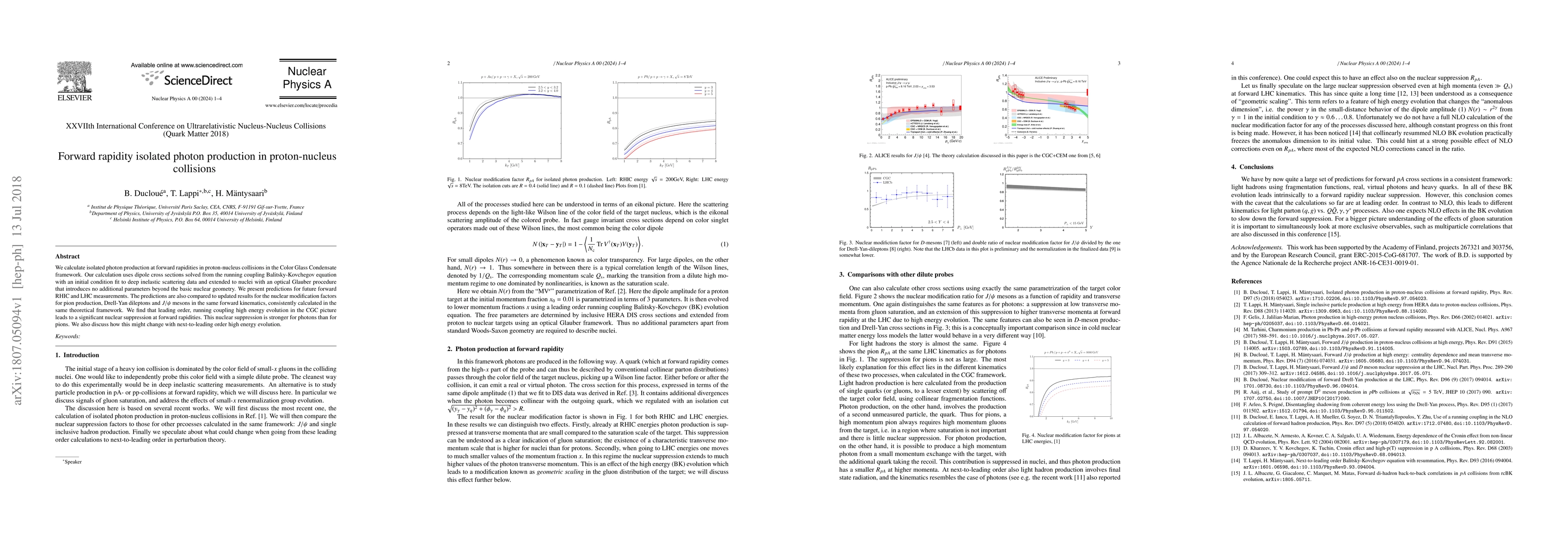 This paper calculates isolated photon production in proton-nucleus collisions at forward rapidities using the Color Glass Condensate framework, finding significant nuclear suppression stronger for photons than pions. Predictions are compared with other forward kinematic processes and suggest potential changes with next-to-leading order evolution.