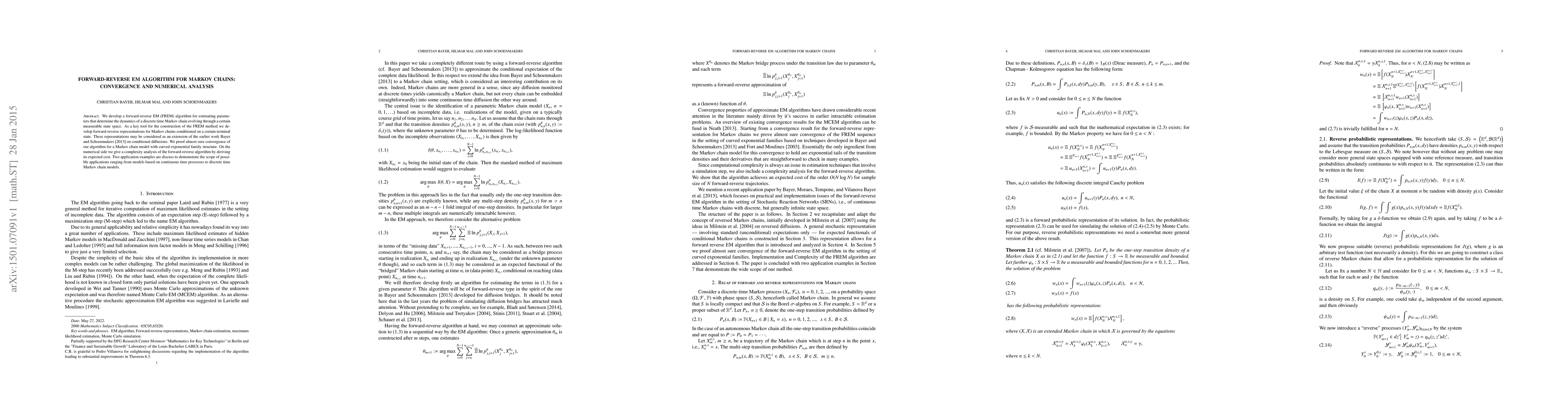 This paper introduces a forward-reverse EM (FREM) algorithm for estimating parameters in discrete time Markov chains, proving its convergence for Markov chains with a curved exponential family structure. It also analyzes the algorithm's computational complexity and provides examples to demonstrate its applicability.