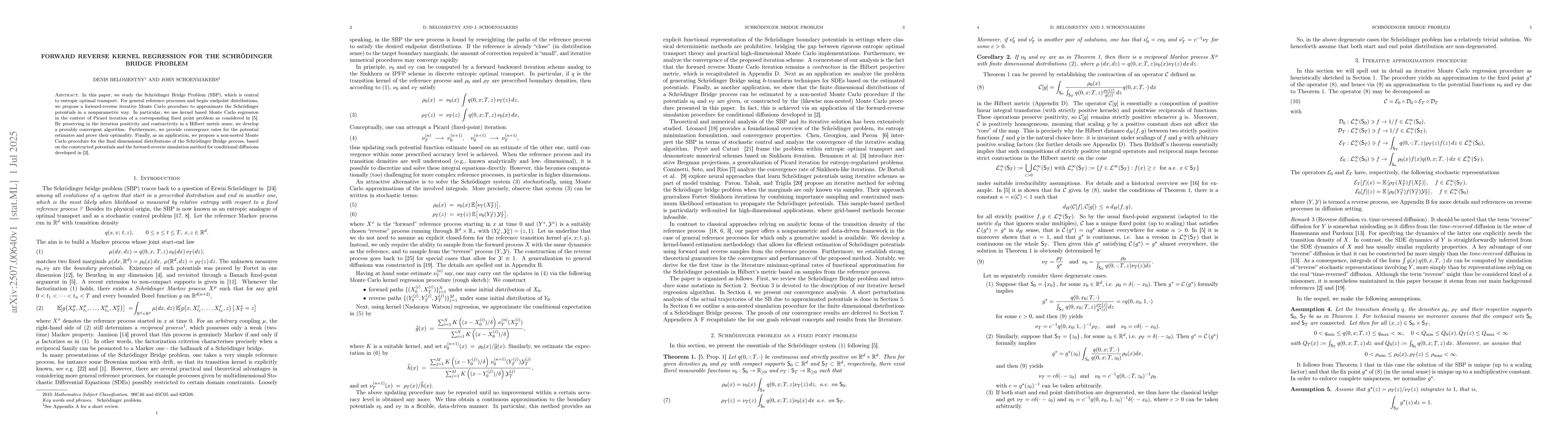 In this paper, we study the Schr\"odinger Bridge Problem (SBP), which is central to entropic optimal transport. For general reference processes and begin--endpoint distributions, we propose a forward-reverse iterative Monte Carlo procedure to approximate the Schr\"odinger potentials in a nonparametric way. In particular, we use kernel based Monte Carlo regression in the context of Picard iteration of a corresponding fixed point problem. By preserving in the iteration positivity and contractivity in a Hilbert metric sense, we develop a provably convergent algorithm. Furthermore, we provide convergence rates for the potential estimates and prove their optimality. Finally, as an application, we propose a non-nested Monte Carlo procedure for the final dimensional distributions of the Schr\"odinger Bridge process, based on the constructed potentials and the forward-reverse simulation method for conditional diffusions.