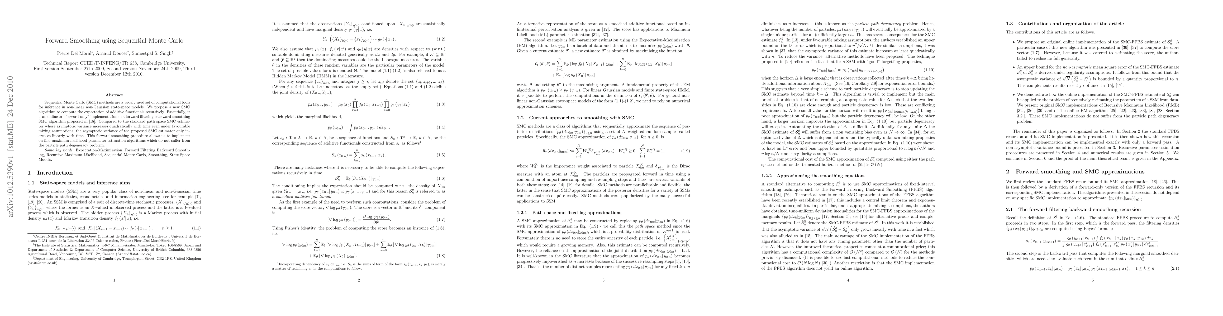 This paper introduces a new Sequential Monte Carlo (SMC) algorithm for computing the expectation of additive functionals recursively, offering a forward-only implementation that reduces asymptotic variance linearly with time compared to standard methods. This forward smoothing approach enables online maximum likelihood parameter estimation without the particle path degeneracy issue.