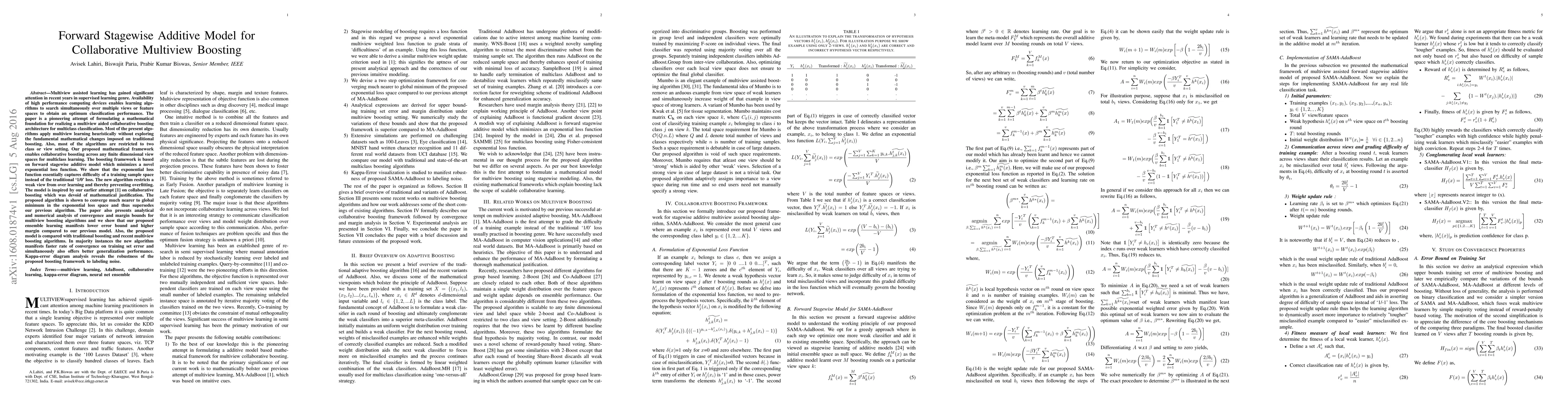 This paper introduces a novel mathematical foundation for multiview collaborative boosting in multiclass classification using a forward stagewise additive model. It proposes a new exponential loss function that better captures training sample difficulty, leading to improved convergence and lower error rates compared to previous models.