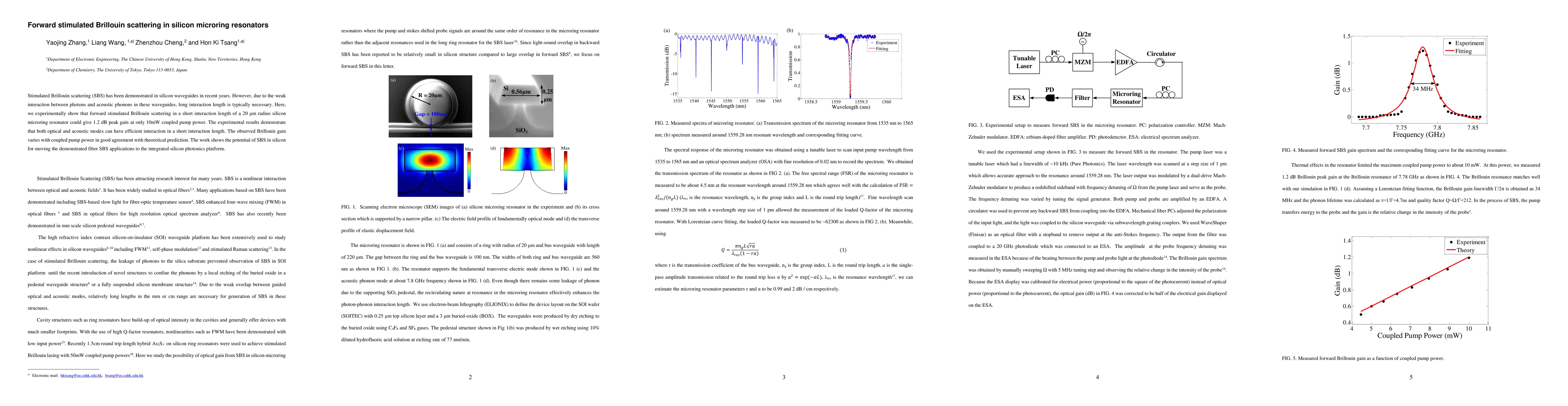 This paper demonstrates forward stimulated Brillouin scattering (SBS) in silicon microring resonators, achieving 1.2 dB peak gain at 10mW pump power over a short 20 µm radius interaction length. The results indicate efficient interaction between optical and acoustic modes, showing potential for integrating SBS applications into silicon photonics.