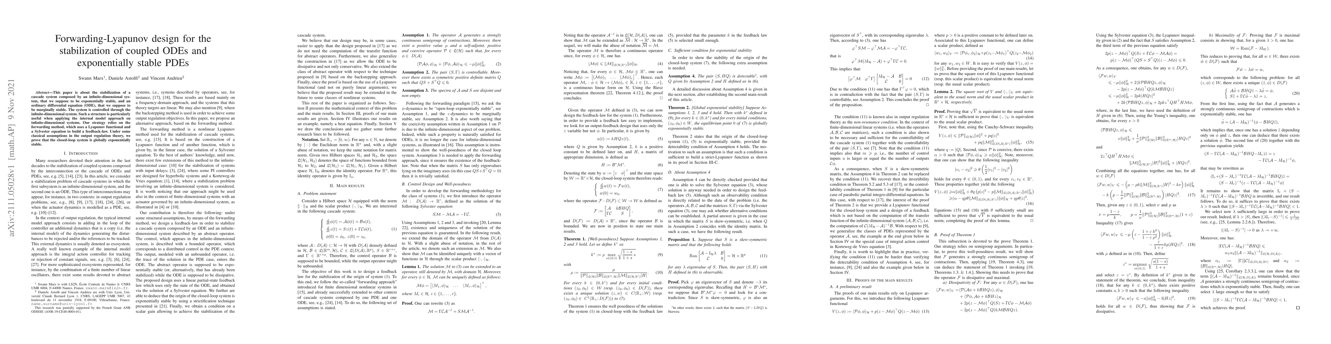 This paper presents a stabilization method for a cascade system combining an exponentially stable infinite-dimensional PDE and a marginally stable ODE, using a forwarding-Lyapunov approach with a feedback-law derived from a Lyapunov functional and a Sylvester equation. The method ensures global exponential stability under standard assumptions in output regulation theory.