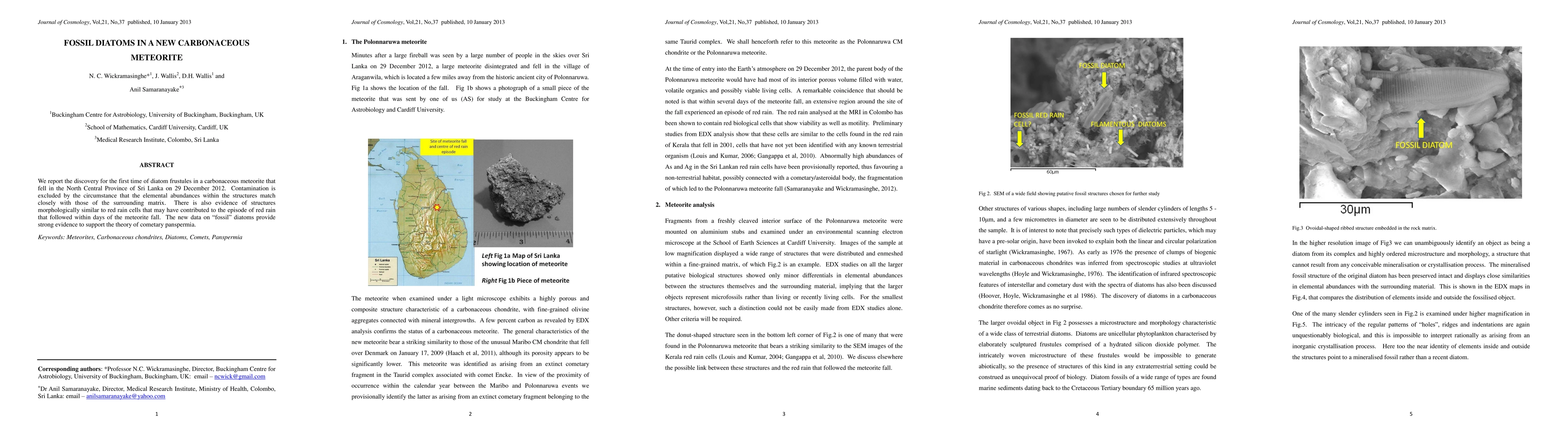 Scientists have discovered fossil diatoms in a carbonaceous meteorite from Sri Lanka, supporting the theory of cometary panspermia. The findings suggest that extraterrestrial life could have been transported to Earth on a comet or meteorite.