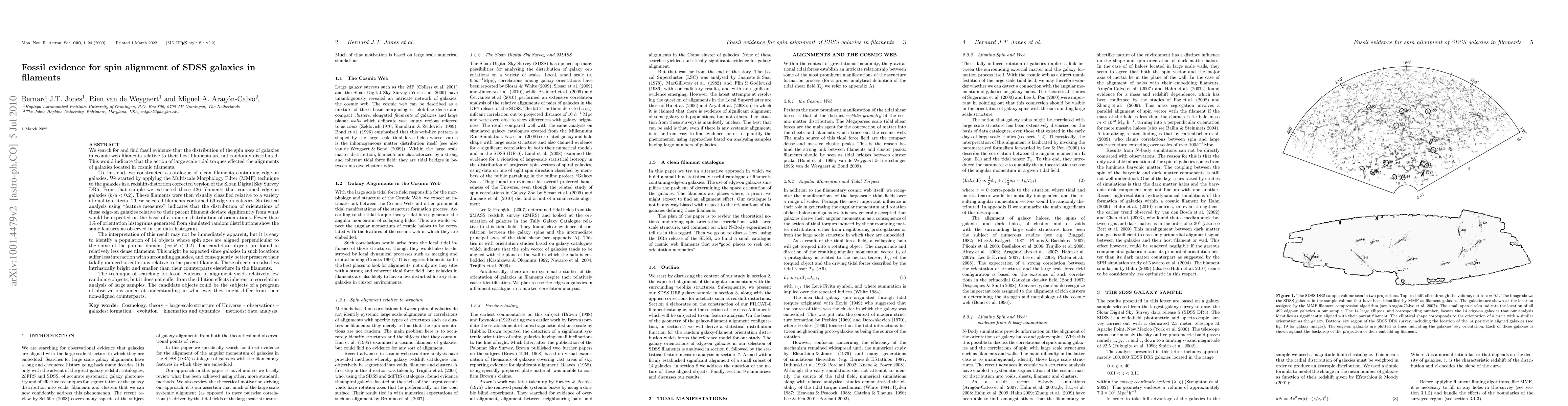 We search for and find fossil evidence that the distribution of the spin axes of galaxies in cosmic web filaments relative to their host filaments are not randomly distributed. This would indicate that the action of large scale tidal torques effected the alignments of galaxies located in cosmic filaments. To this end, we constructed a catalogue of clean filaments containing edge-on galaxies. We started by applying the Multiscale Morphology Filter (MMF) technique to the galaxies in a redshift-distortion corrected version of the Sloan Digital Sky Survey DR5. From that sample we extracted those 426 filaments that contained edge-on galaxies (b/a < 0.2). These filaments were then visually classified relative to a variety of quality criteria. Statistical analysis using "feature measures" indicates that the distribution of orientations of these edge-on galaxies relative to their parent filament deviate significantly from what would be expected on the basis of a random distribution of orientations. The interpretation of this result may not be immediately apparent, but it is easy to identify a population of 14 objects whose spin axes are aligned perpendicular to the spine of the parent filament (\cos \theta < 0.2). The candidate objects are found in relatively less dense filaments. This might be expected since galaxies in such locations suffer less interaction with surrounding galaxies, and consequently better preserve their tidally induced orientations relative to the parent filament. The technique of searching for fossil evidence of alignment yields relatively few candidate objects, but it does not suffer from the dilution effects inherent in correlation analysis of large samples.