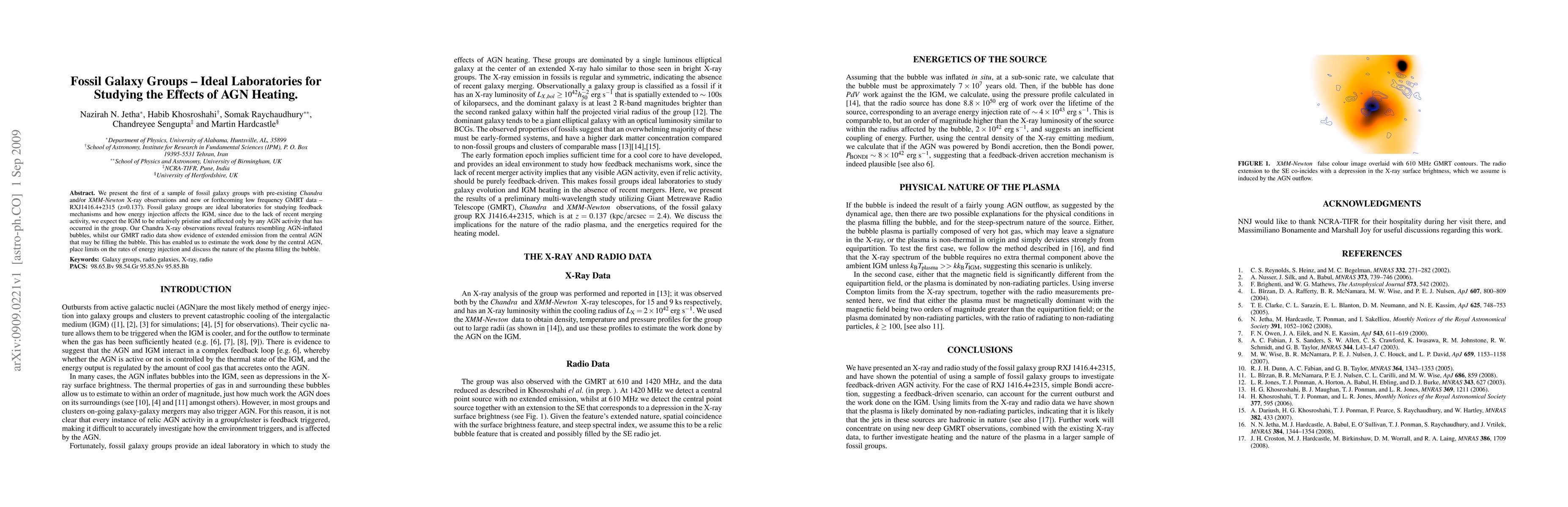 This paper investigates fossil galaxy group RXJ1416.4+2315 to study AGN heating effects, revealing AGN-inflated bubbles and extended radio emissions from the central AGN. The analysis estimates AGN work, energy injection rates, and discusses the bubble's plasma nature.