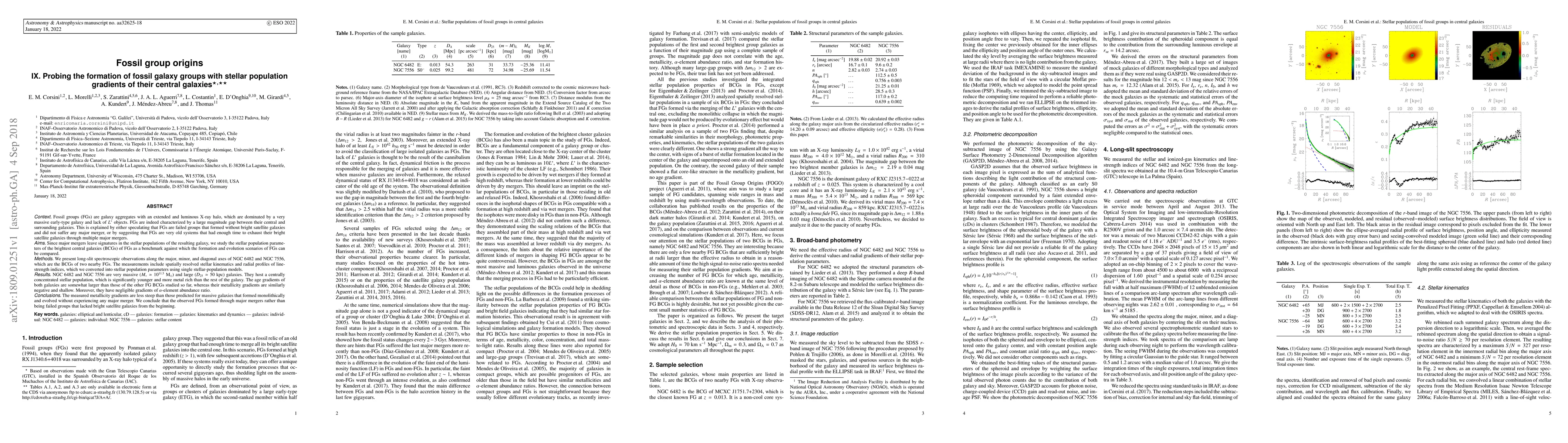 This paper investigates the formation of fossil galaxy groups (FGs) by examining the stellar population gradients of their central galaxies. The study finds that NGC 6482 and NGC 7556, the central galaxies of two FGs, show evidence of major mergers through their stellar population parameters, suggesting FGs formed through mergers rather than lacking bright satellites.