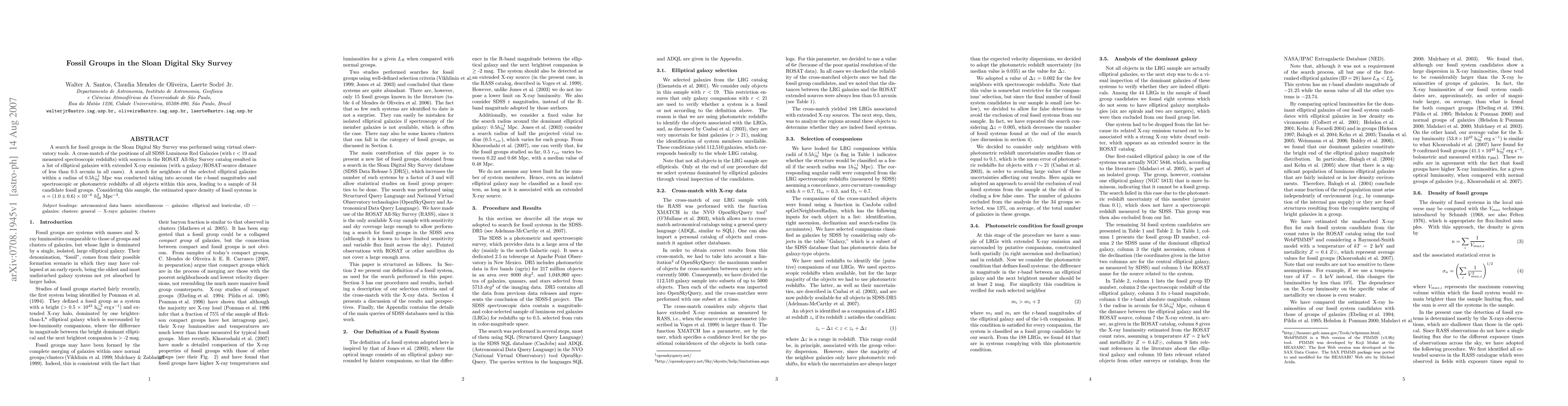 This study identifies 34 candidate fossil groups in the Sloan Digital Sky Survey by matching Luminous Red Galaxies with extended X-ray emission from the ROSAT catalog, and examining nearby galaxies within a specified radius. The estimated space density of fossil systems is $(1.0 \pm 0.6) \times 10^{-6} h_{50}^3$ Mpc$^{-3}$.