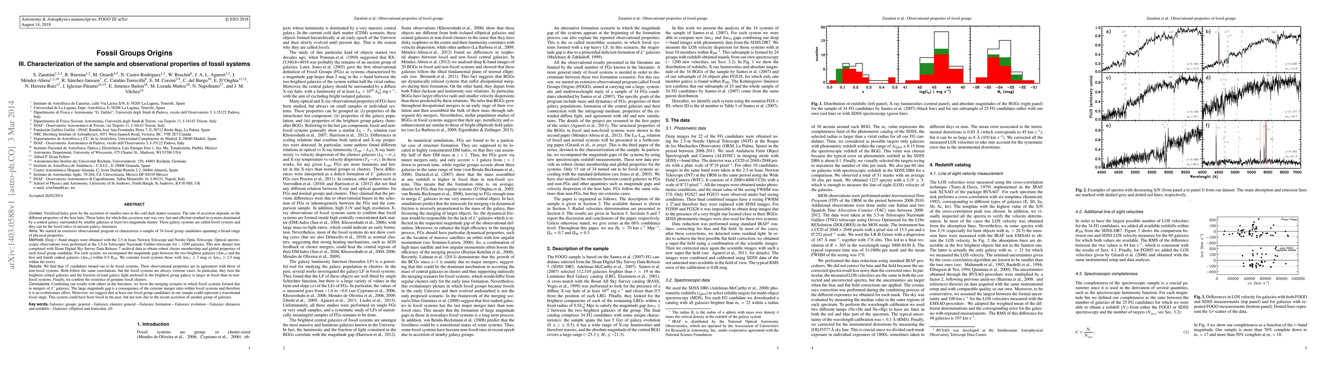 (Abridged) Fossil systems are group- or cluster-sized objects whose luminosity is dominated by a very massive central galaxy. In the current cold dark matter scenario, these objects formed hierarchically at an early epoch of the Universe and then slowly evolved until present day. That is the reason why they are called {\it fossils}. We started an extensive observational program to characterize a sample of 34 fossil group candidates spanning a broad range of physical properties. Deep $r-$band images were taken for each candidate and optical spectroscopic observations were obtained for $\sim$ 1200 galaxies. This new dataset was completed with SDSS DR7 archival data to obtain robust cluster membership and global properties of each fossil group candidate. For each system, we recomputed the magnitude gaps between the two brightest galaxies ($\Delta m_{12}$) and the first and fourth ranked galaxies ($\Delta m_{14}$) within 0.5 $R_{{\rm 200}}$. We consider fossil systems those with $\Delta m_{12} \ge 2$ mag or $\Delta m_{14} \ge 2.5$ mag within the errors. We find that 15 candidates turned out to be fossil systems. Their observational properties agree with those of non-fossil systems. Both follow the same correlations, but fossils are always extreme cases. In particular, they host the brightest central galaxies and the fraction of total galaxy light enclosed in the central galaxy is larger in fossil than in non-fossil systems. Finally, we confirm the existence of genuine fossil clusters. Combining our results with others in the literature, we favor the merging scenario in which fossil systems formed due to mergers of $L^\ast$ galaxies. The large magnitude gap is a consequence of the extreme merger ratio within fossil systems and therefore it is an evolutionary effect. Moreover, we suggest that at least one candidate in our sample could represent a transitional fossil stage.