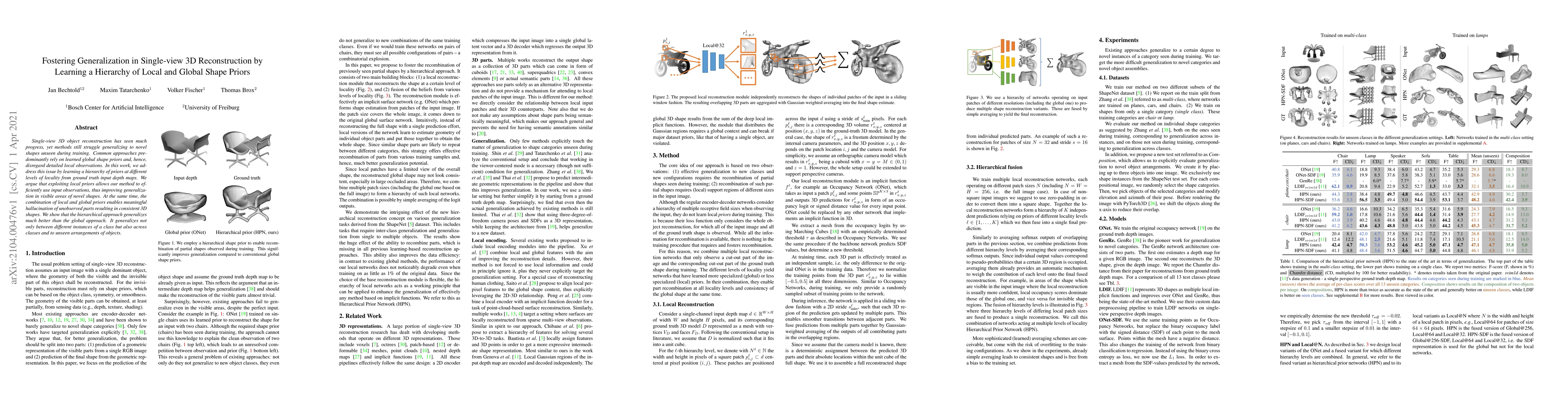 This paper proposes a method for single-view 3D reconstruction that enhances generalization by learning a hierarchy of local and global shape priors from depth maps. The approach leverages local priors for visible areas and combines them with global priors for hallucinating unseen parts, leading to better generalization across different object classes and arrangements.