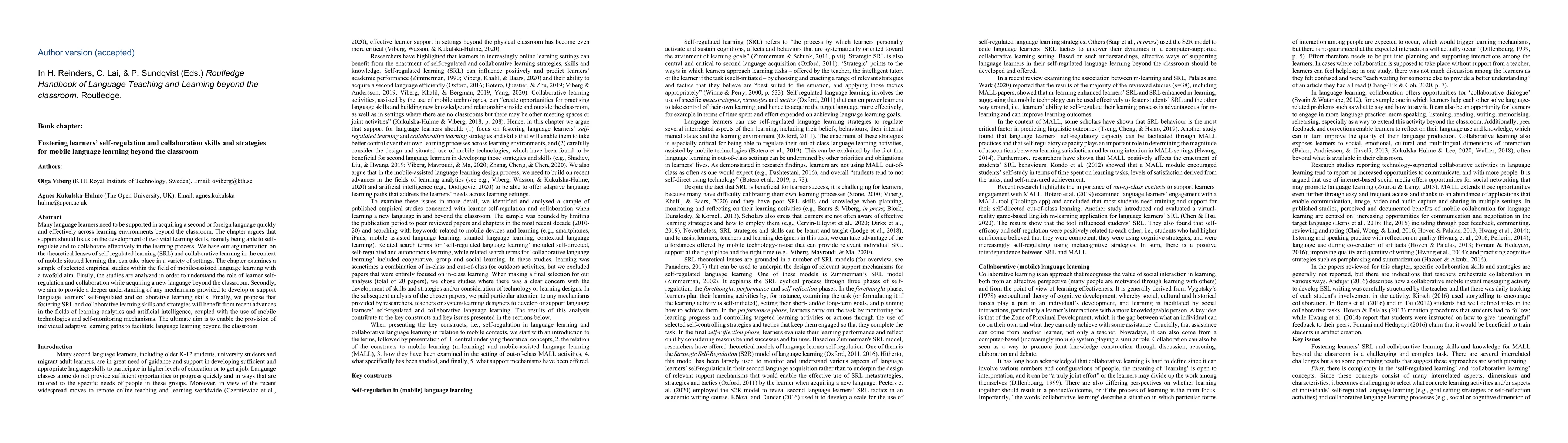 Many language learners need to be supported in acquiring a second or foreign language quickly and effectively across learning environments beyond the classroom. The chapter argues that support should focus on the development of two vital learning skills, namely being able to self-regulate and to collaborate effectively in the learning process. We base our argumentation on the theoretical lenses of self-regulated learning (SRL) and collaborative learning in the context of mobile situated learning that can take place in a variety of settings. The chapter examines a sample of selected empirical studies within the field of mobile-assisted language learning with a twofold aim. Firstly, the studies are analyzed in order to understand the role of learner self-regulation and collaboration while acquiring a new language beyond the classroom. Secondly, we aim to provide a deeper understanding of any mechanisms provided to develop or support language learners' self-regulated and collaborative learning skills. Finally, we propose that fostering SRL and collaborative learning skills and strategies will benefit from recent advances in the fields of learning analytics and artificial intelligence, coupled with the use of mobile technologies and self-monitoring mechanisms. The ultimate aim is to enable the provision of individual adaptive learning paths to facilitate language learning beyond the classroom.