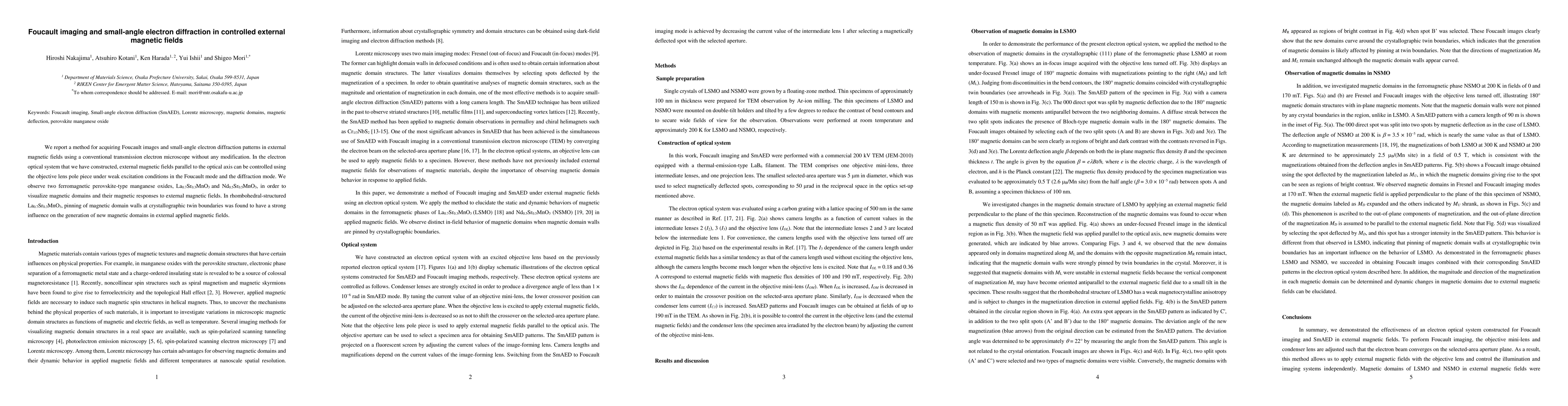 This paper presents a method to obtain Foucault images and small-angle electron diffraction patterns in external magnetic fields using a conventional transmission electron microscope. The study visualizes magnetic domains and their responses in magnetic oxides, revealing the influence of twin boundaries on domain wall pinning in La$_{0.7}$Sr$_{0.3}$MnO$_{3}$.