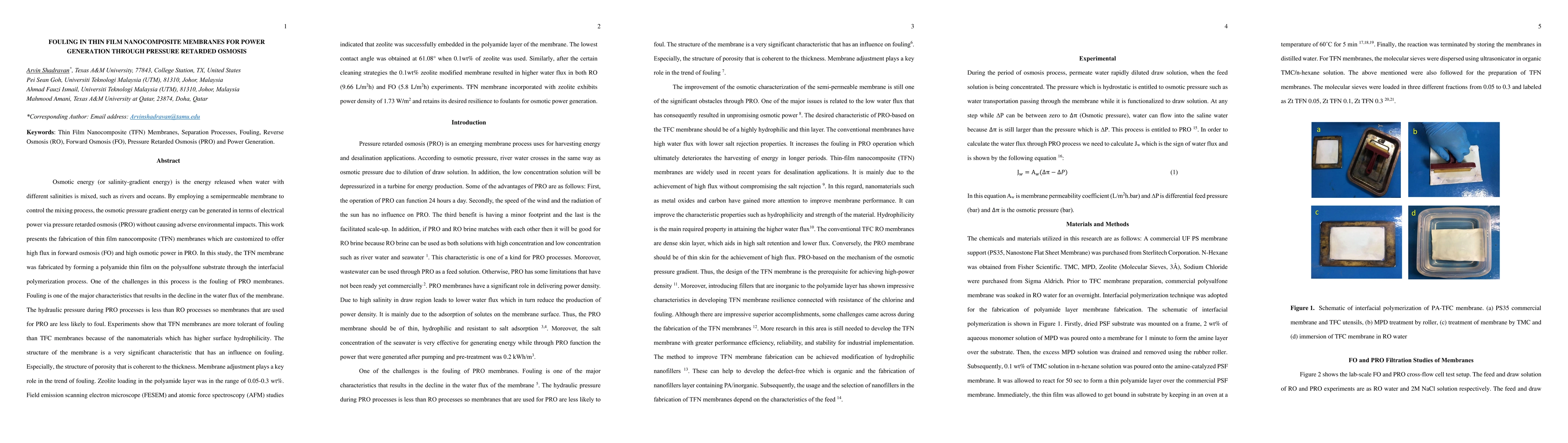 This paper investigates the fabrication of thin film nanocomposite (TFN) membranes for pressure retarded osmosis (PRO) to generate osmotic pressure gradient energy. The study demonstrates that TFN membranes, due to their higher surface hydrophilicity from nanomaterials, are more resistant to fouling compared to traditional thin film composite (TFC) membranes, thus maintaining higher water flux.