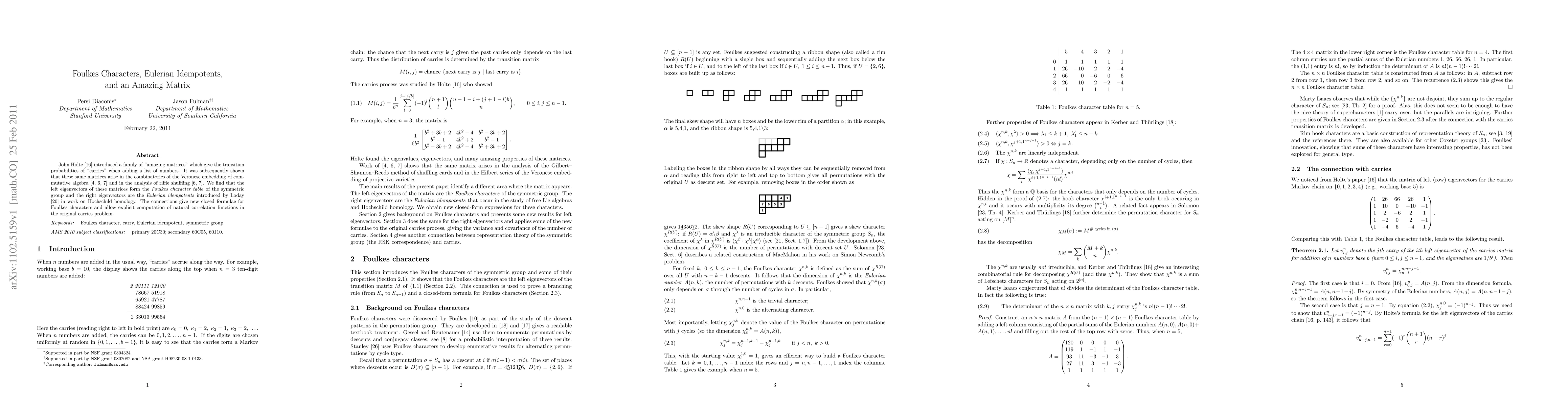 John Holte [16] introduced a family of "amazing matrices" which give the transition probabilities of "carries" when adding a list of numbers. It was subsequently shown that these same matrices arise in the combinatorics of the Veronese embedding of commutative algebra [4,6,7] and in the analysis of riffle shuffling [6,7]. We find that the left eigenvectors of these matrices form the Foulkes character table of the symmetric group and the right eigenvectors are the Eulerian idempotents introduced by Loday [20] in work on Hochschild homology. The connections give new closed formulae for Foulkes characters and allow explicit computation of natural correlation functions in the original carries problem.