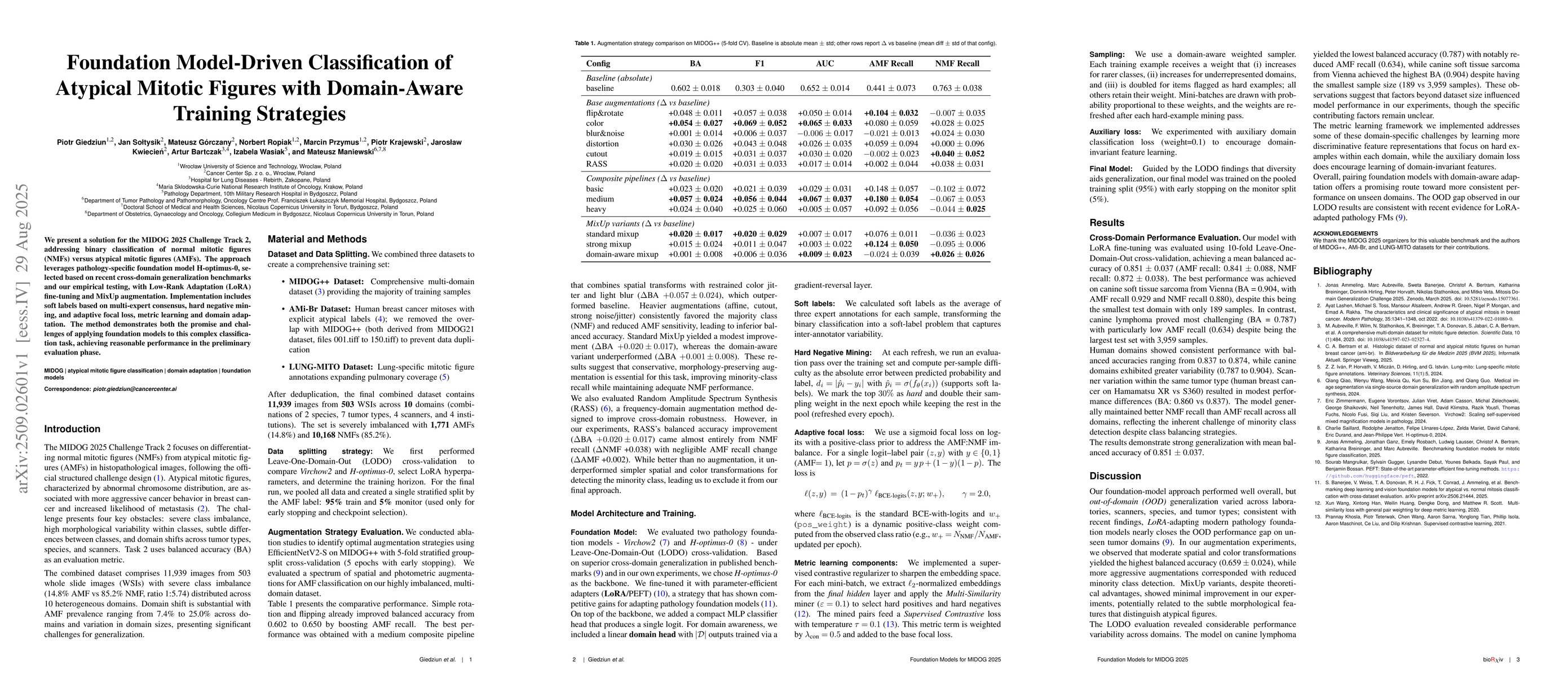 We present a solution for the MIDOG 2025 Challenge Track~2, addressing binary classification of normal mitotic figures (NMFs) versus atypical mitotic figures (AMFs). The approach leverages pathology-specific foundation model H-optimus-0, selected based on recent cross-domain generalization benchmarks and our empirical testing, with Low-Rank Adaptation (LoRA) fine-tuning and MixUp augmentation. Implementation includes soft labels based on multi-expert consensus, hard negative mining, and adaptive focal loss, metric learning and domain adaptation. The method demonstrates both the promise and challenges of applying foundation models to this complex classification task, achieving reasonable performance in the preliminary evaluation phase.