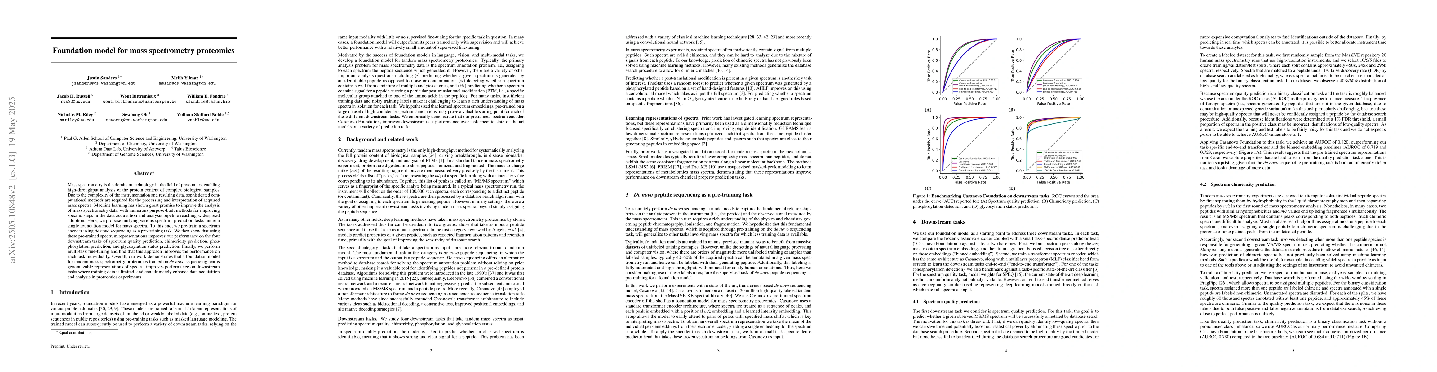 The development and validation of a foundation model for tandem mass spectrometry proteomics, pre-trained on de novo sequencing and fine-tuned for multiple downstream tasks.