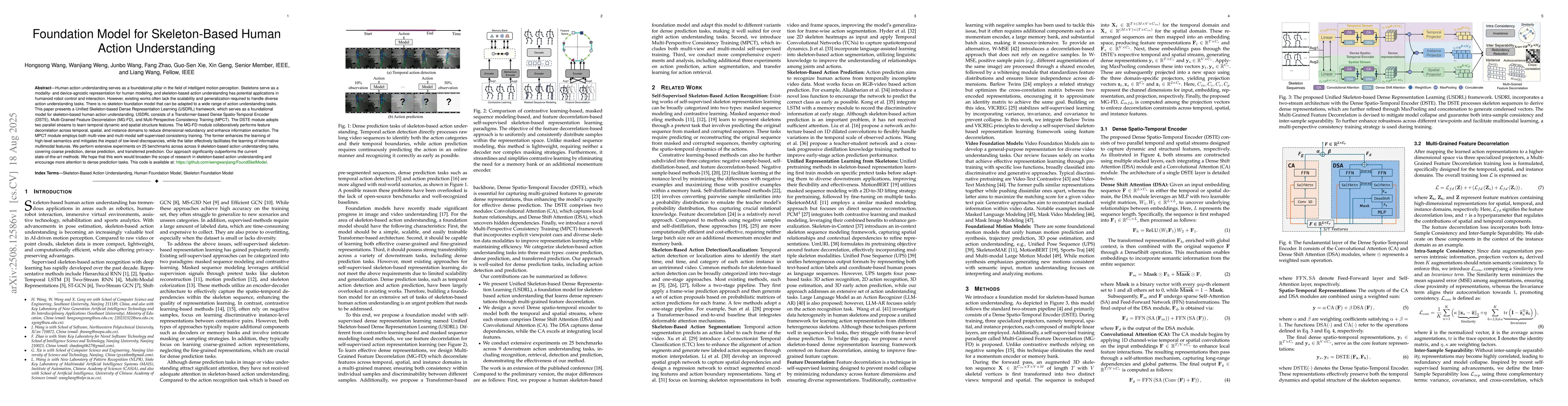 Human action understanding serves as a foundational pillar in the field of intelligent motion perception. Skeletons serve as a modality- and device-agnostic representation for human modeling, and skeleton-based action understanding has potential applications in humanoid robot control and interaction. \RED{However, existing works often lack the scalability and generalization required to handle diverse action understanding tasks. There is no skeleton foundation model that can be adapted to a wide range of action understanding tasks}. This paper presents a Unified Skeleton-based Dense Representation Learning (USDRL) framework, which serves as a foundational model for skeleton-based human action understanding. USDRL consists of a Transformer-based Dense Spatio-Temporal Encoder (DSTE), Multi-Grained Feature Decorrelation (MG-FD), and Multi-Perspective Consistency Training (MPCT). The DSTE module adopts two parallel streams to learn temporal dynamic and spatial structure features. The MG-FD module collaboratively performs feature decorrelation across temporal, spatial, and instance domains to reduce dimensional redundancy and enhance information extraction. The MPCT module employs both multi-view and multi-modal self-supervised consistency training. The former enhances the learning of high-level semantics and mitigates the impact of low-level discrepancies, while the latter effectively facilitates the learning of informative multimodal features. We perform extensive experiments on 25 benchmarks across across 9 skeleton-based action understanding tasks, covering coarse prediction, dense prediction, and transferred prediction. Our approach significantly outperforms the current state-of-the-art methods. We hope that this work would broaden the scope of research in skeleton-based action understanding and encourage more attention to dense prediction tasks.