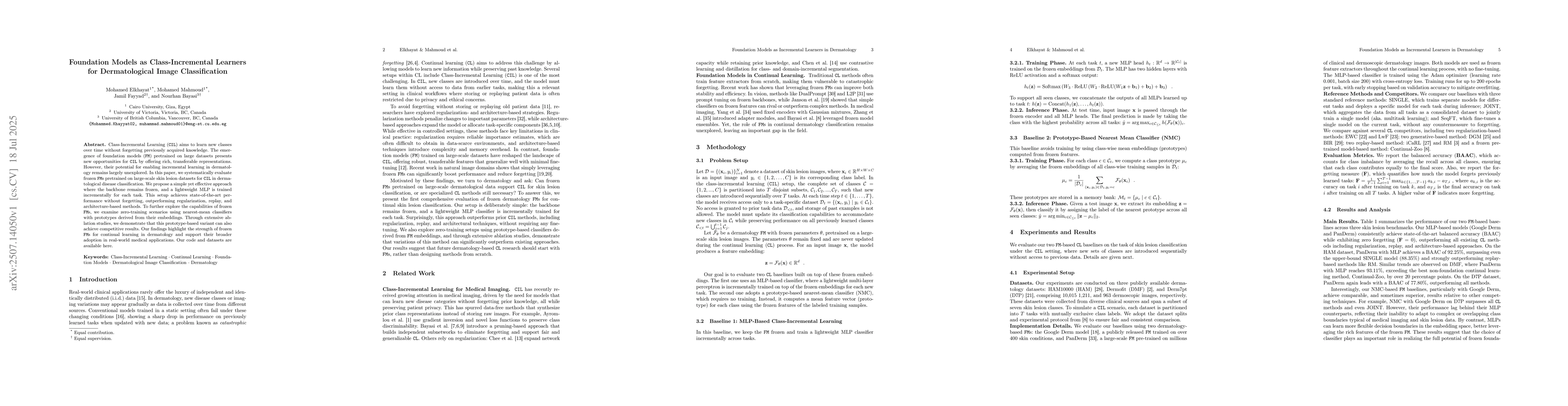 Class-Incremental Learning (CIL) aims to learn new classes over time without forgetting previously acquired knowledge. The emergence of foundation models (FM) pretrained on large datasets presents new opportunities for CIL by offering rich, transferable representations. However, their potential for enabling incremental learning in dermatology remains largely unexplored. In this paper, we systematically evaluate frozen FMs pretrained on large-scale skin lesion datasets for CIL in dermatological disease classification. We propose a simple yet effective approach where the backbone remains frozen, and a lightweight MLP is trained incrementally for each task. This setup achieves state-of-the-art performance without forgetting, outperforming regularization, replay, and architecture based methods. To further explore the capabilities of frozen FMs, we examine zero training scenarios using nearest mean classifiers with prototypes derived from their embeddings. Through extensive ablation studies, we demonstrate that this prototype based variant can also achieve competitive results. Our findings highlight the strength of frozen FMs for continual learning in dermatology and support their broader adoption in real world medical applications. Our code and datasets are available here.