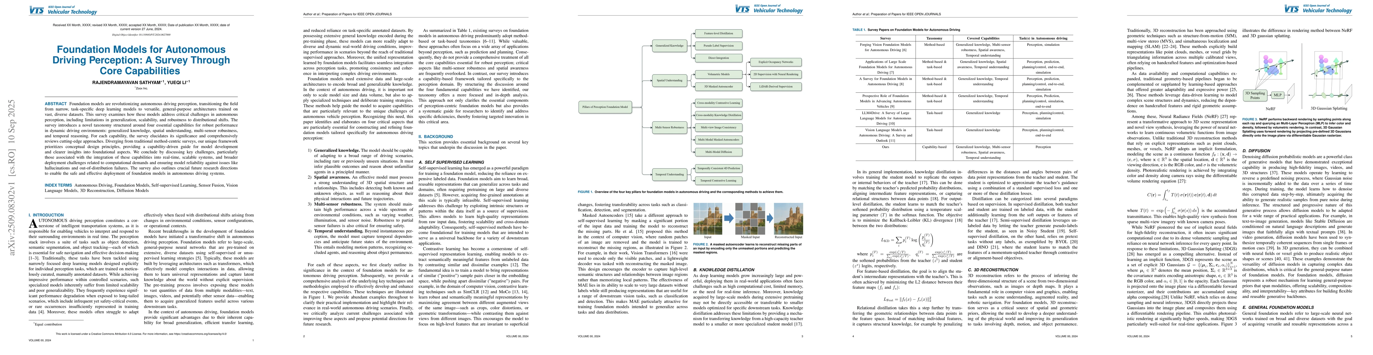 Foundation models are revolutionizing autonomous driving perception, transitioning the field from narrow, task-specific deep learning models to versatile, general-purpose architectures trained on vast, diverse datasets. This survey examines how these models address critical challenges in autonomous perception, including limitations in generalization, scalability, and robustness to distributional shifts. The survey introduces a novel taxonomy structured around four essential capabilities for robust performance in dynamic driving environments: generalized knowledge, spatial understanding, multi-sensor robustness, and temporal reasoning. For each capability, the survey elucidates its significance and comprehensively reviews cutting-edge approaches. Diverging from traditional method-centric surveys, our unique framework prioritizes conceptual design principles, providing a capability-driven guide for model development and clearer insights into foundational aspects. We conclude by discussing key challenges, particularly those associated with the integration of these capabilities into real-time, scalable systems, and broader deployment challenges related to computational demands and ensuring model reliability against issues like hallucinations and out-of-distribution failures. The survey also outlines crucial future research directions to enable the safe and effective deployment of foundation models in autonomous driving systems.