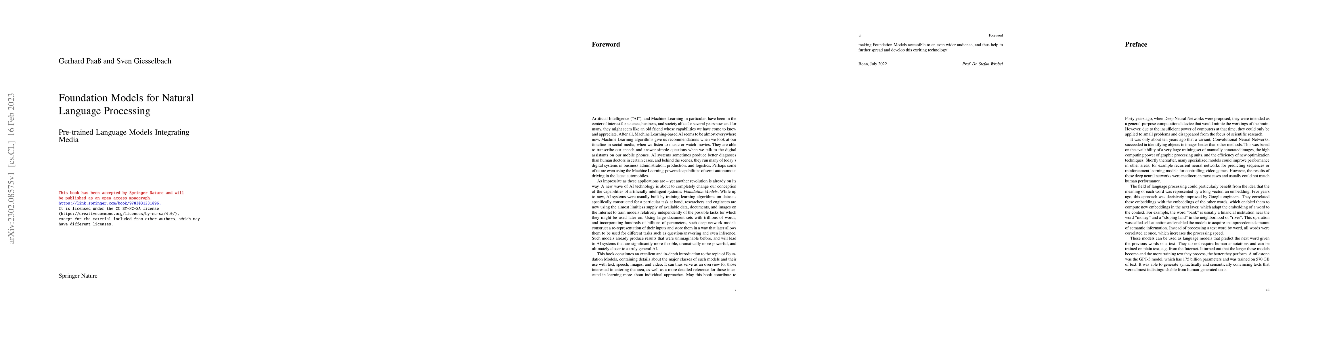 This book provides a comprehensive overview of Foundation Models in NLP, detailing pre-trained language models like BERT, GPT, and transformers, and their applications across various media and tasks. It discusses improvements and future developments in these models, alongside economic opportunities and risk mitigation in AI.