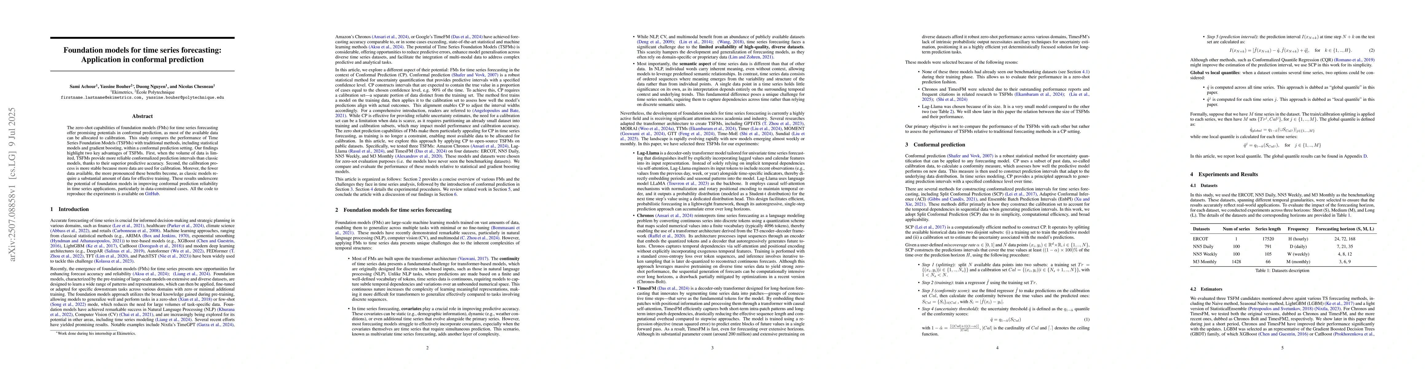The zero-shot capabilities of foundation models (FMs) for time series forecasting offer promising potentials in conformal prediction, as most of the available data can be allocated to calibration. This study compares the performance of Time Series Foundation Models (TSFMs) with traditional methods, including statistical models and gradient boosting, within a conformal prediction setting. Our findings highlight two key advantages of TSFMs. First, when the volume of data is limited, TSFMs provide more reliable conformalized prediction intervals than classic models, thanks to their superior predictive accuracy. Second, the calibration process is more stable because more data are used for calibration. Morever, the fewer data available, the more pronounced these benefits become, as classic models require a substantial amount of data for effective training. These results underscore the potential of foundation models in improving conformal prediction reliability in time series applications, particularly in data-constrained cases. All the code to reproduce the experiments is available.
