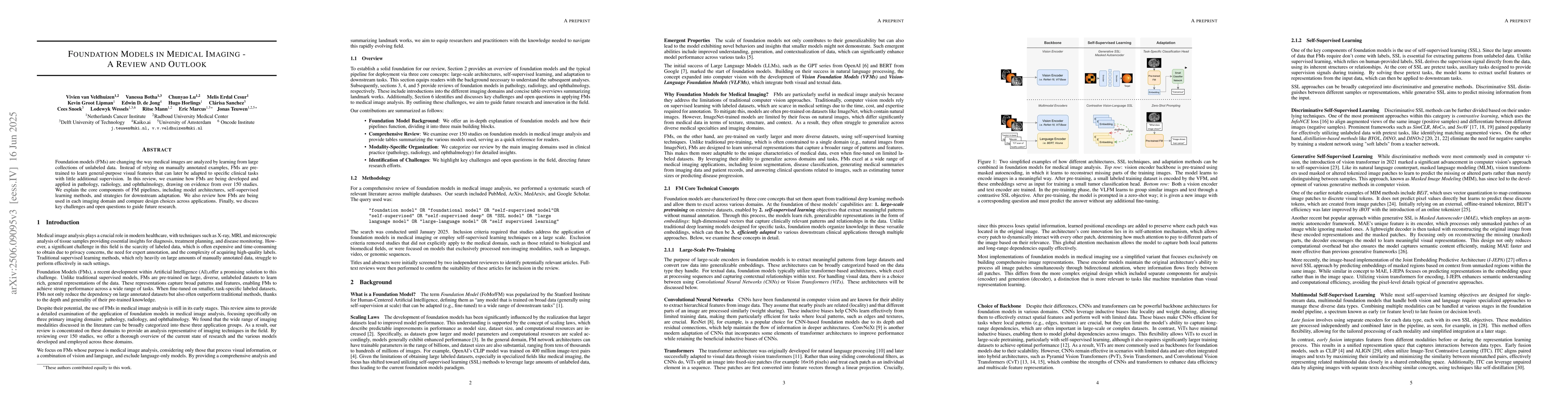 The paper reviews and analyzes the development and application of foundation models (FMs) in medical imaging domains such as pathology, radiology, and ophthalmology, drawing on evidence from over 150 studies.